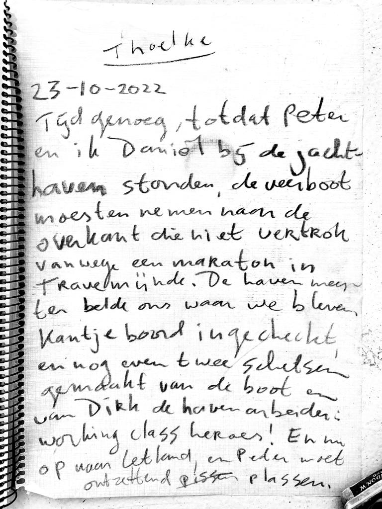 Met mijn dierbare vriend (en Rode Schuur partner in crime) Peter Minnee en een etspers in het campertje op naar dochter Rhodé in Riga, Letland. Bijna de ferryboot gemist, 24 uur op de Oostzee… het is een “Buurman & Buurman” avontuur! Ons Katwijkse hart ging sneller kloppen van de boottocht met de kleinste ferry van Stena Line, die af en toe behoorlijk tekeerging. Gelukkig hebben wij als echte Katwijkers geen last van zeeziekte en maakte ik op de boot de mooiste aquarellen. Op de terugreis was het campertje een stuk lichter en Rhodé blij met haar etspers!