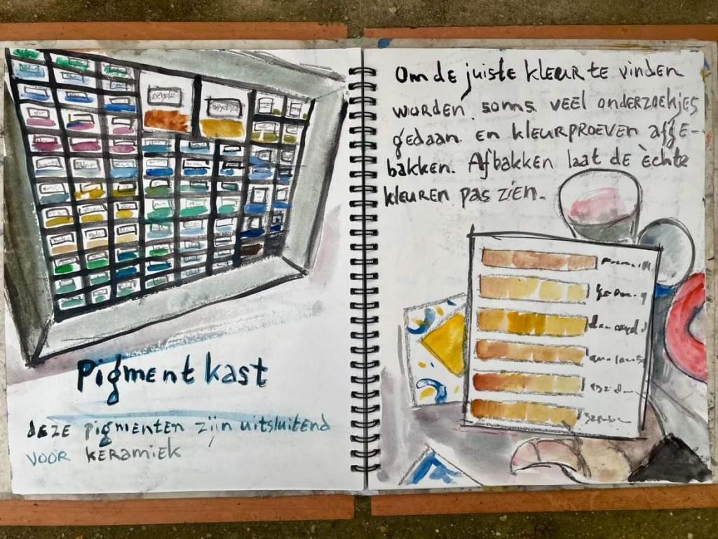 Ook heb ik een geweldig tegelatelier Aresta Viva bezocht, waar ik mocht leren over het proces van tegels maken op de ouderwetse, ambachtelijke manier! Leve het Ambacht in Portugal! Hieronder een stukje uit mijn Portugal schetsboek, een aquarel verslag van het bezoek aan het tegelatelier.