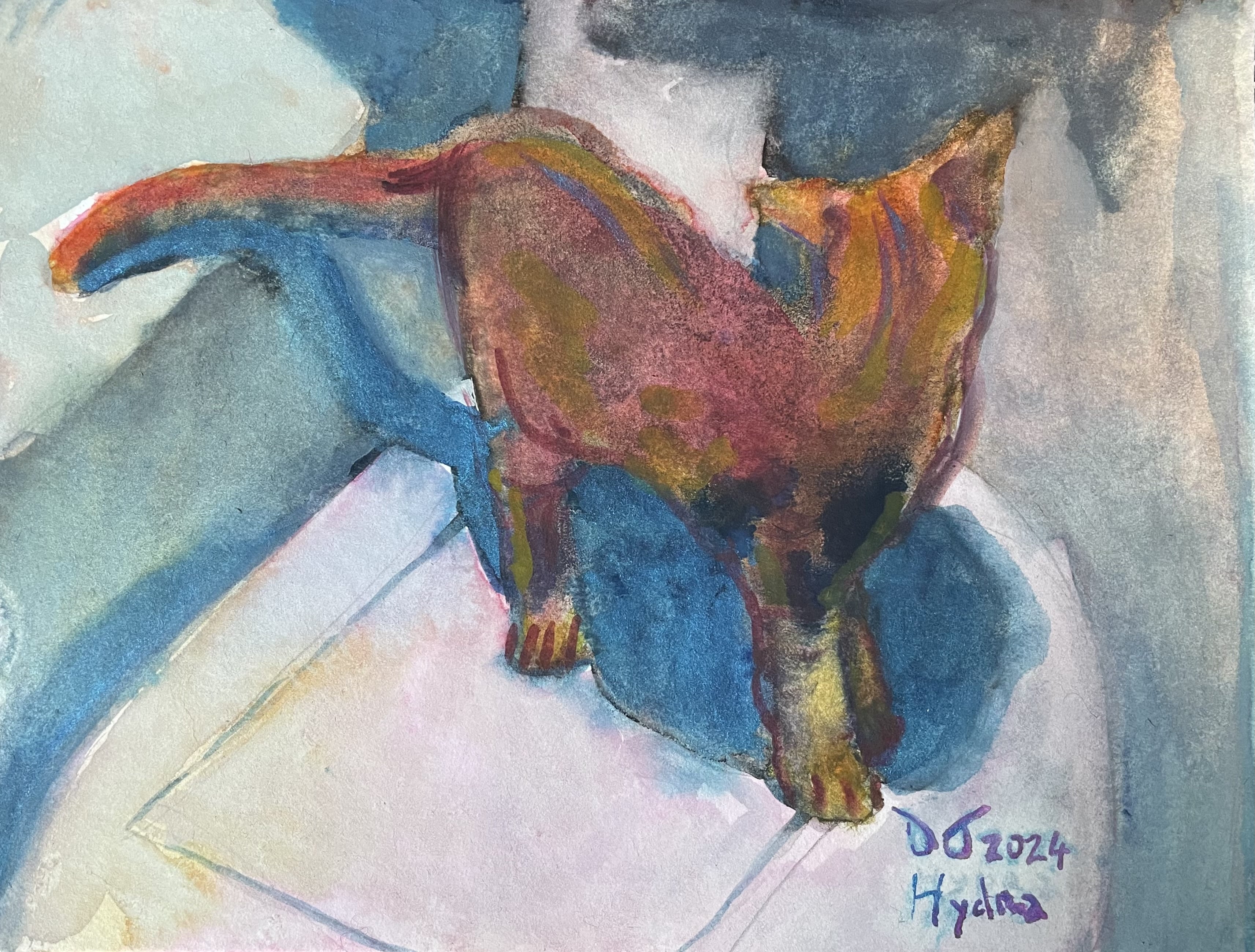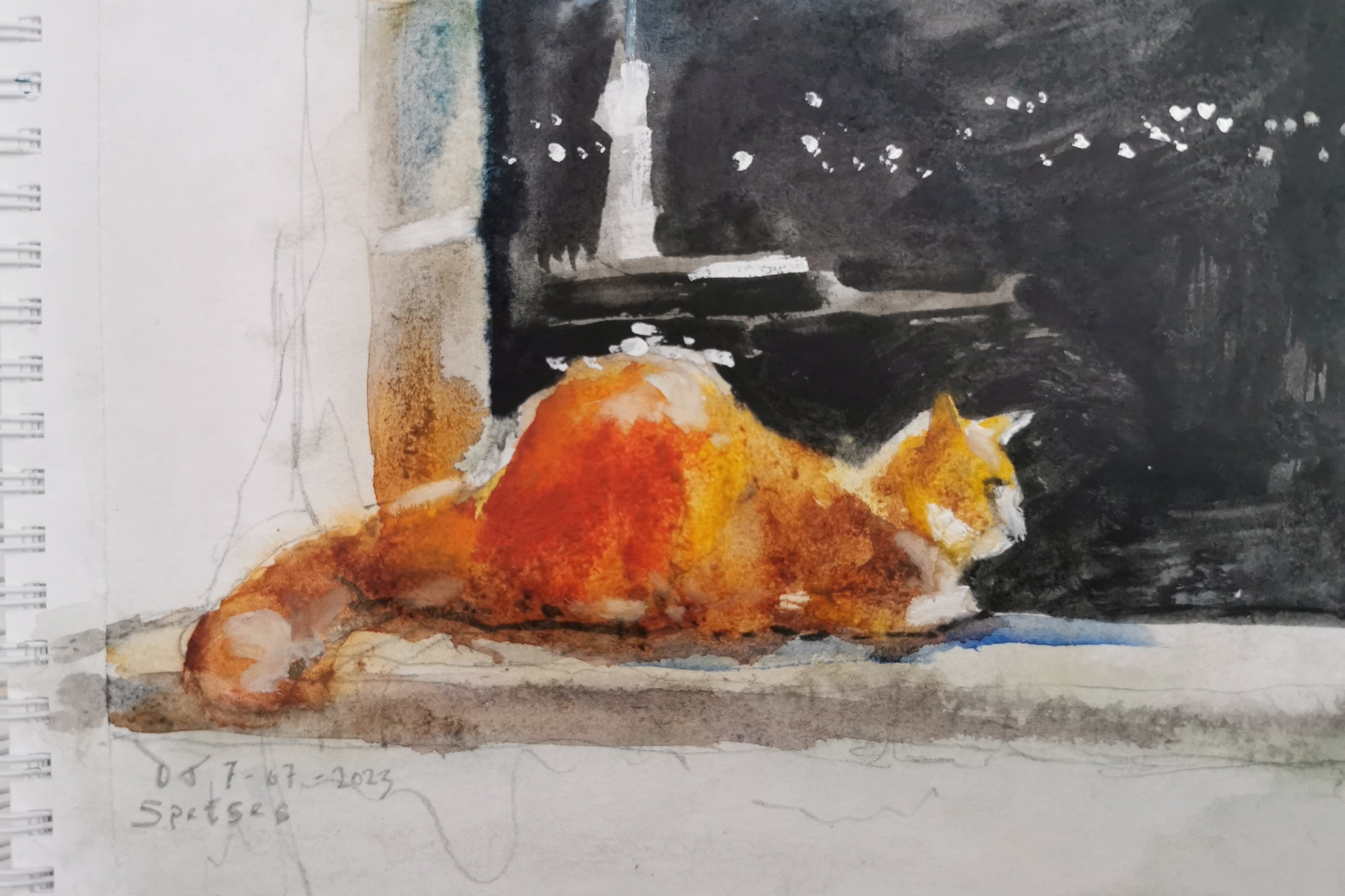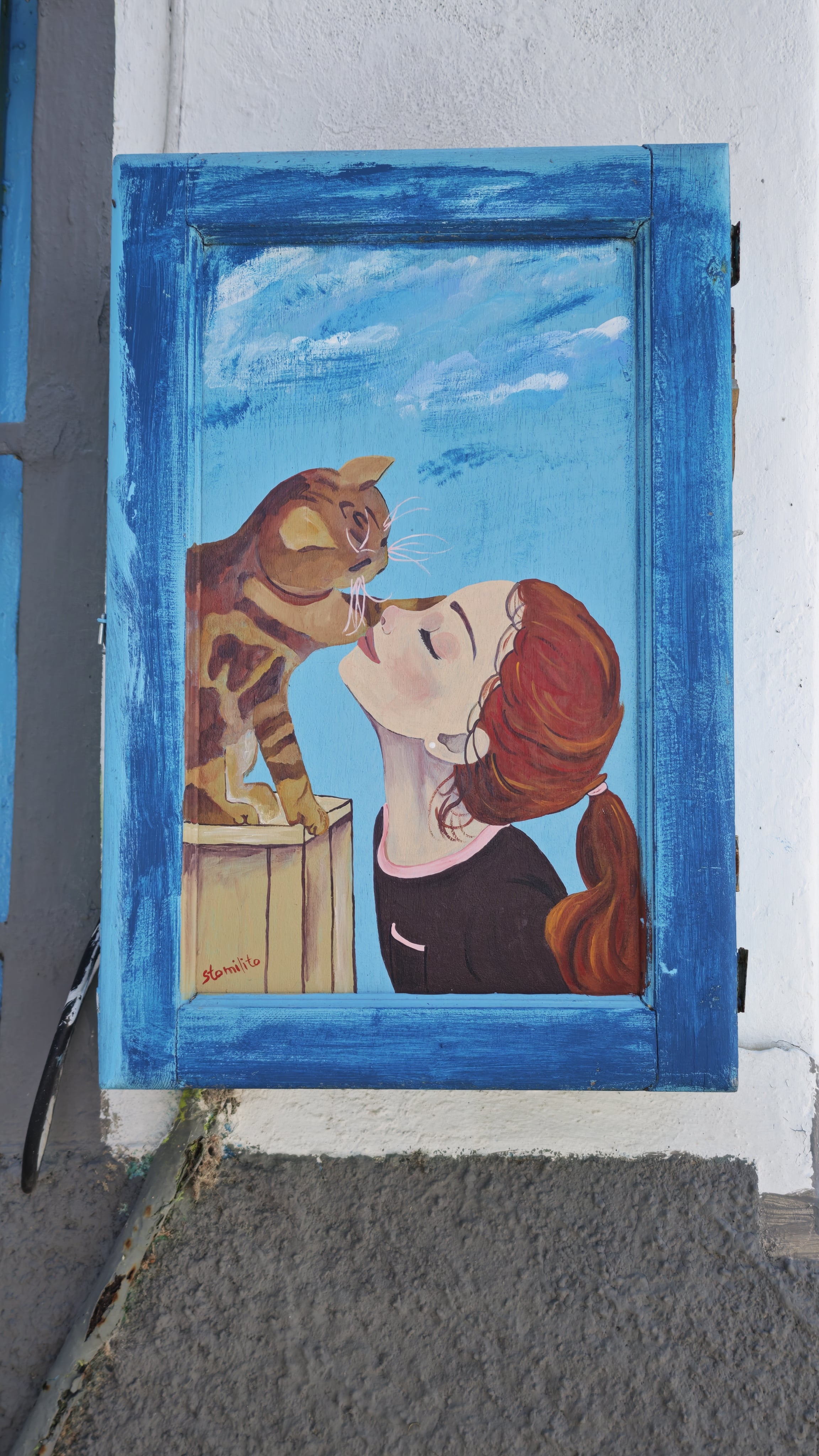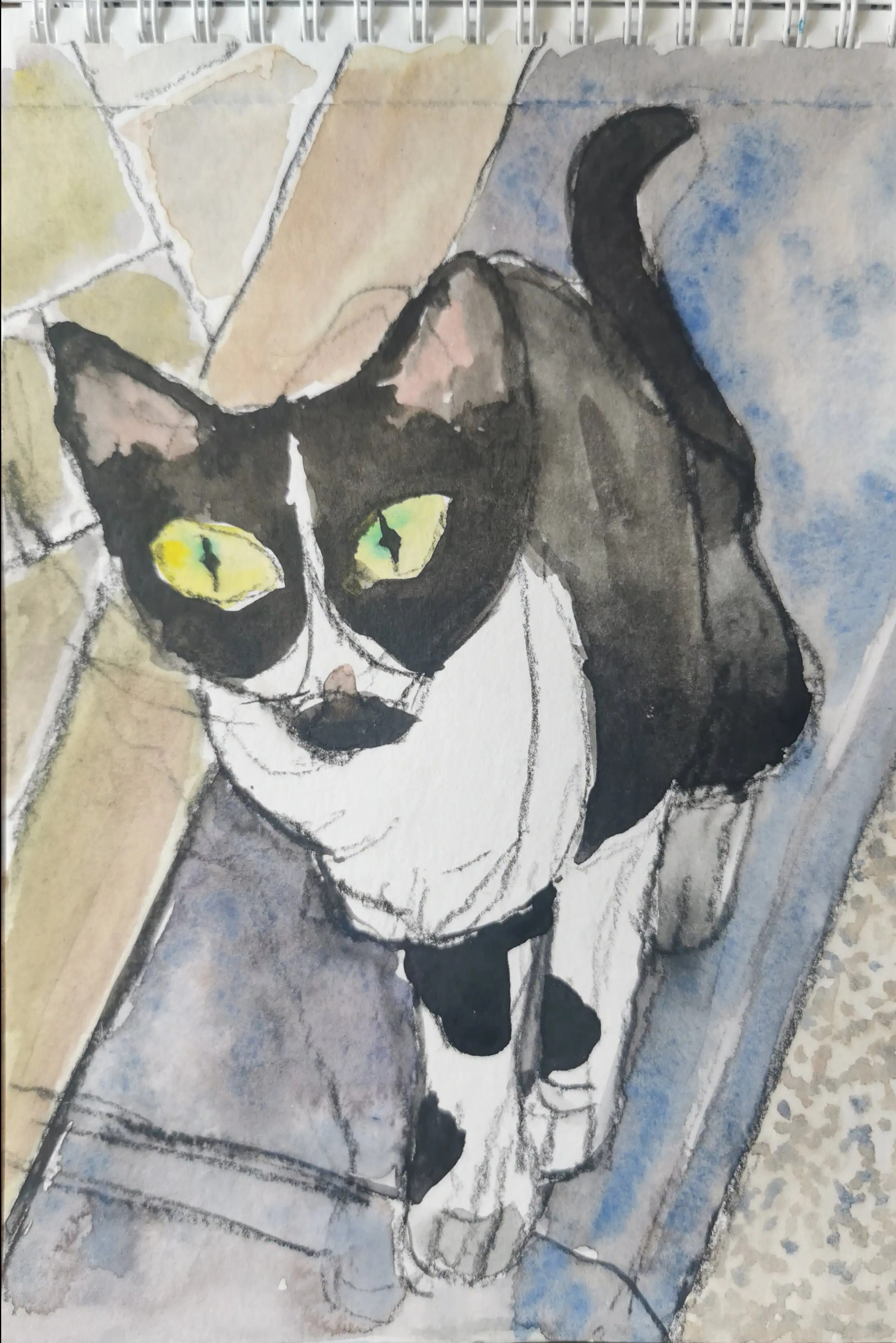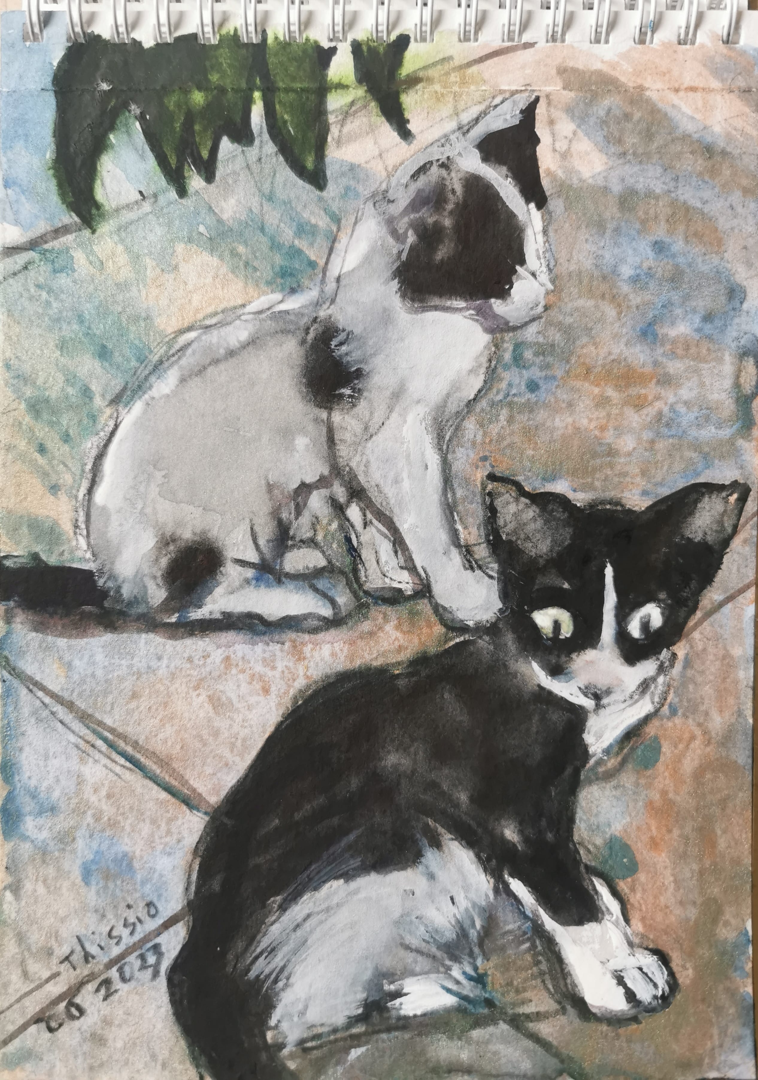 In Griekenland lopen veel (zwerf)katten en die zijn allemaal fotogeniek en ze vragen erom om door mij vastgelegd te worden op papier met aquarelverf! Hun bestaan is net een spiegel van het wel en wee van de mensen daar, het menselijk toneel van drama en tragedie, woorden die hun oorsprong vinden in het oude Griekenland.