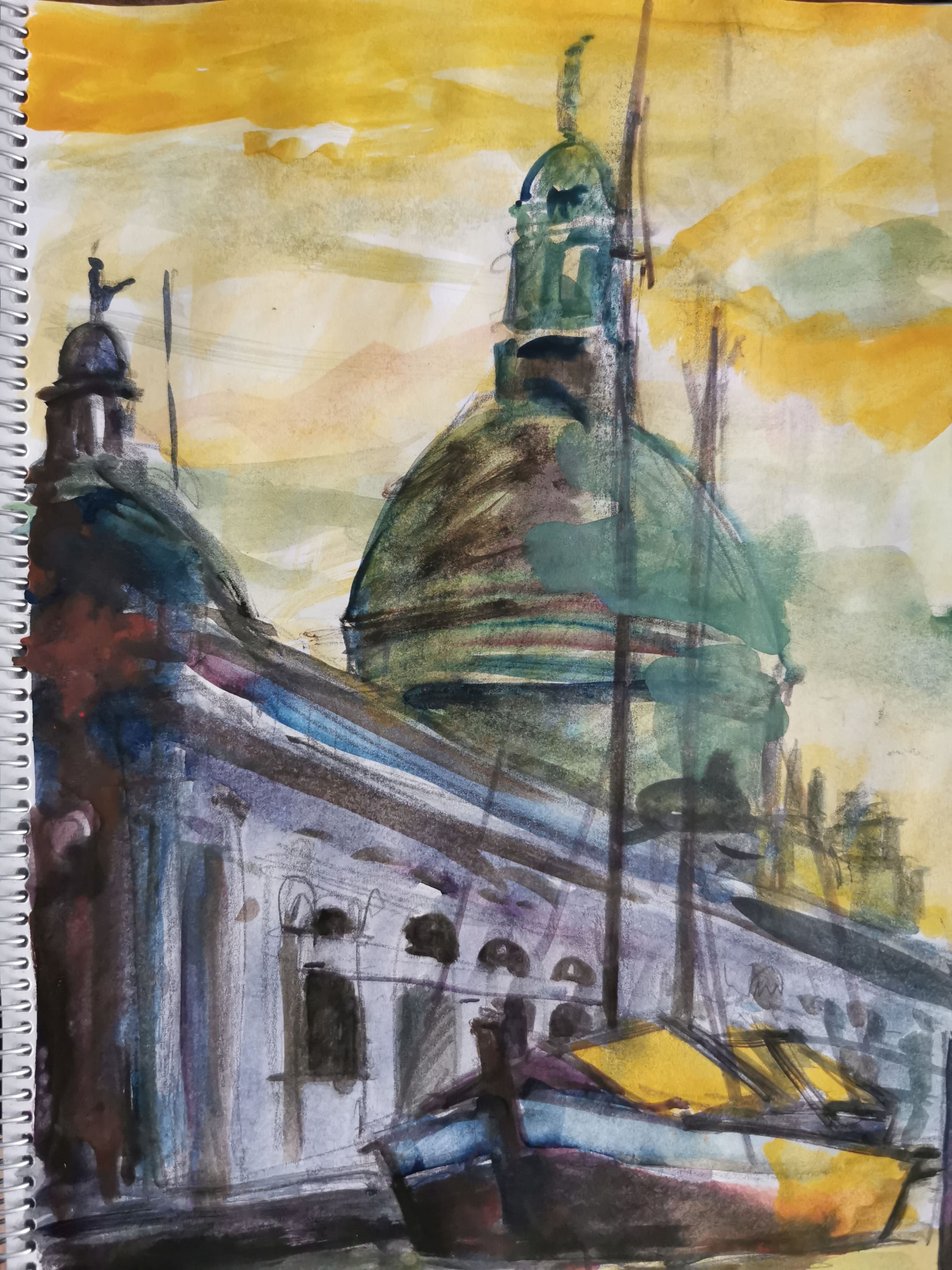 Maar meestal teken of aquarelleer ik in mijn schetsboek en beschrijf ik wat ik schets. Ik maak er een soort dagboek van en deel pagina’s uit mijn schetsboek op mijn sociale media-accounts, zodat mijn volgers virtueel mee kunnen reizen. Soms teken ik ook op een servetje aan een tafel in een restaurant de omgeving na, inclusief de obers! Het zijn spontane reisimpressies die ter plekke worden vastgelegd en waar ik intens van geniet.