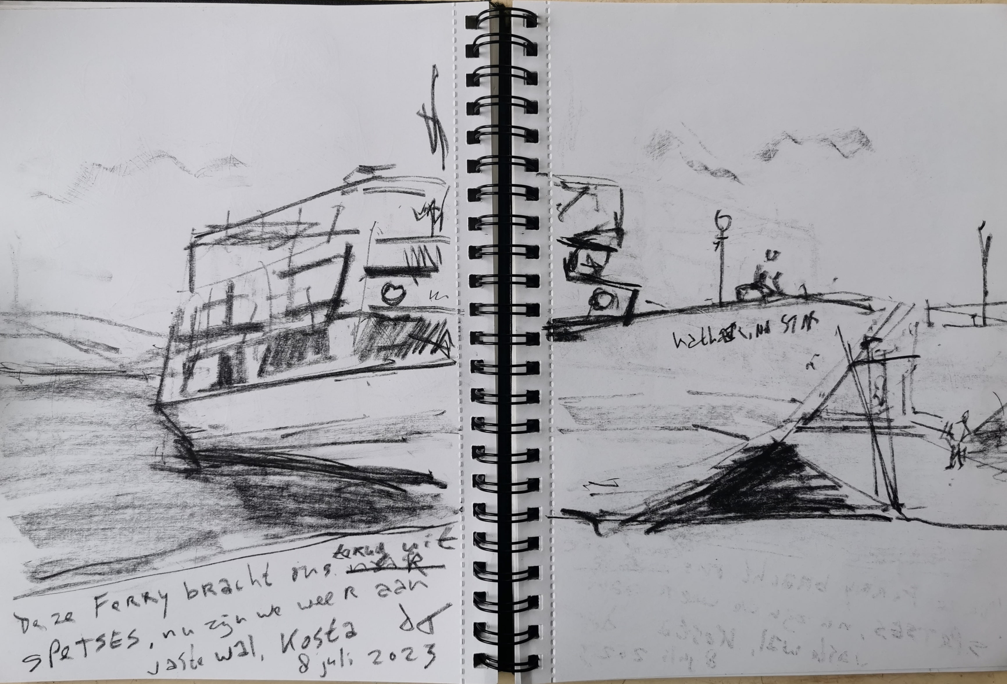 Hieronder een paar tekeningen en aquarellen uit mijn schetsboek en een filmpje van de 2 “kwajongens” die eindelijk op de ferryboot zaten!
