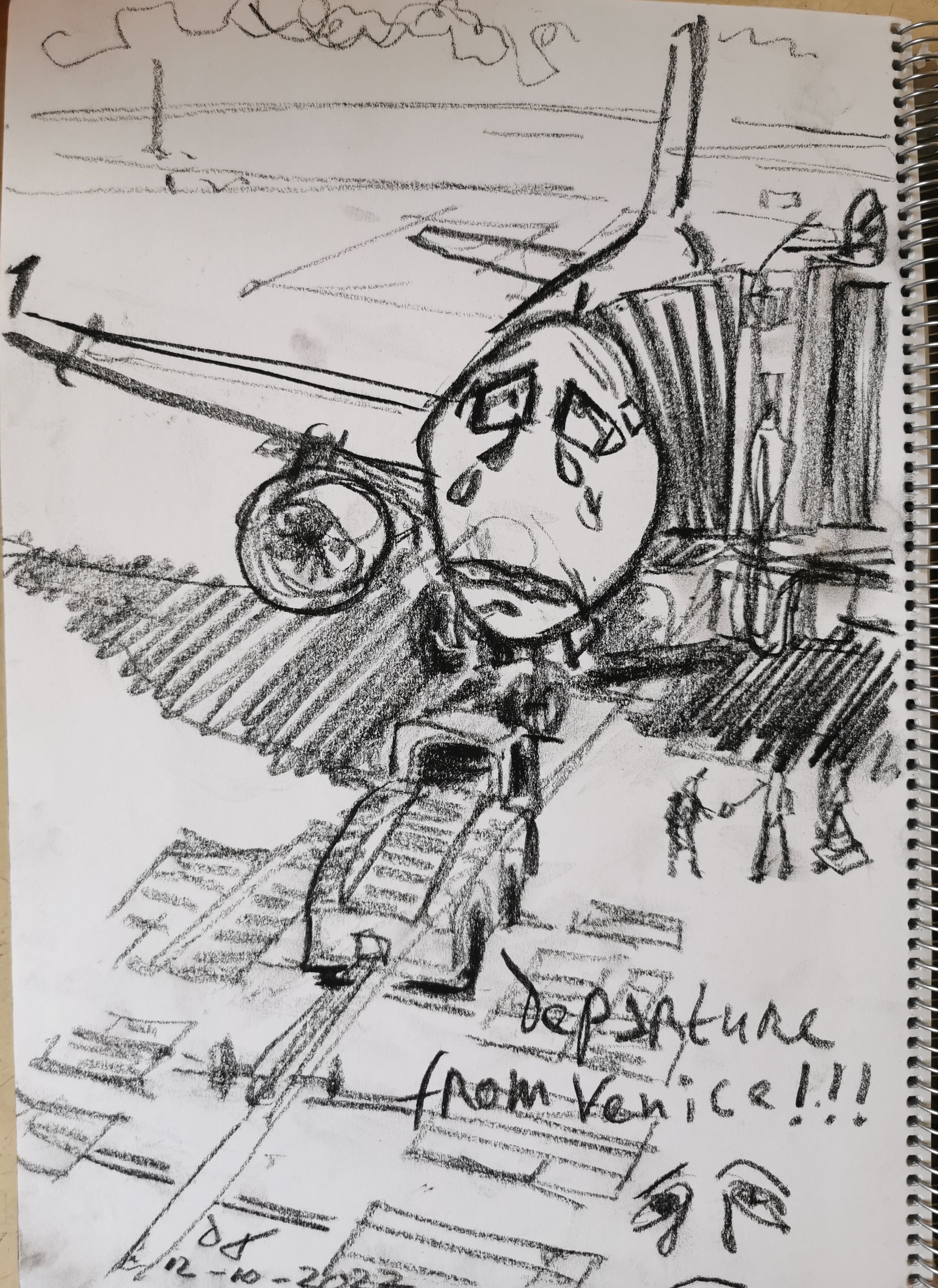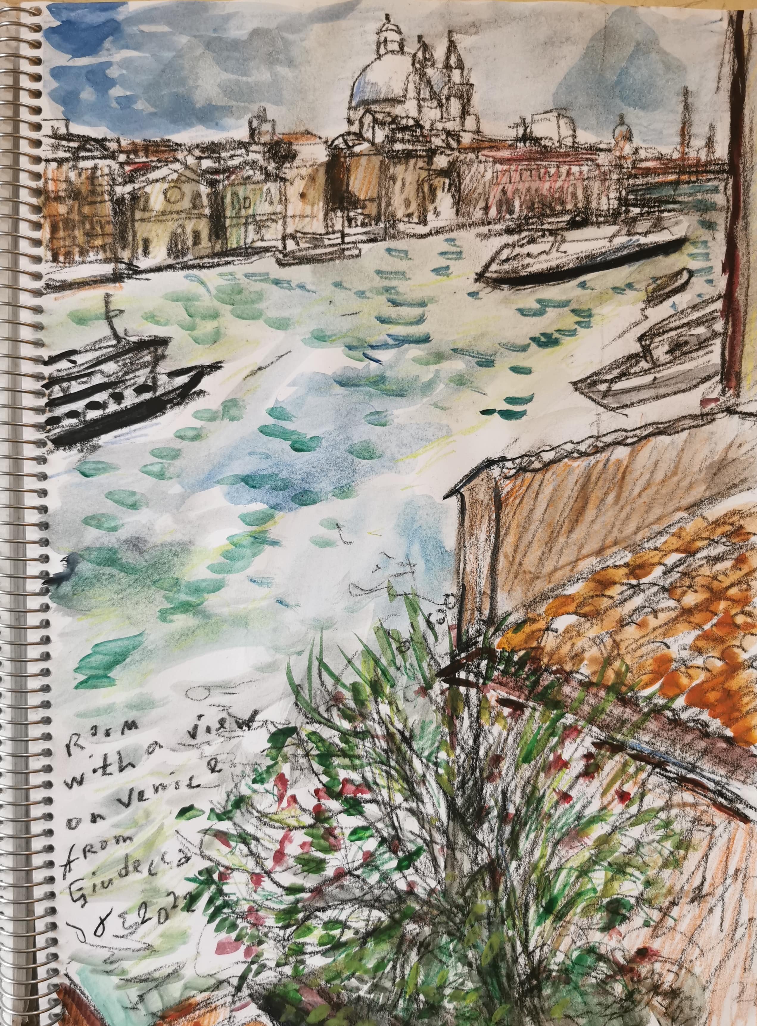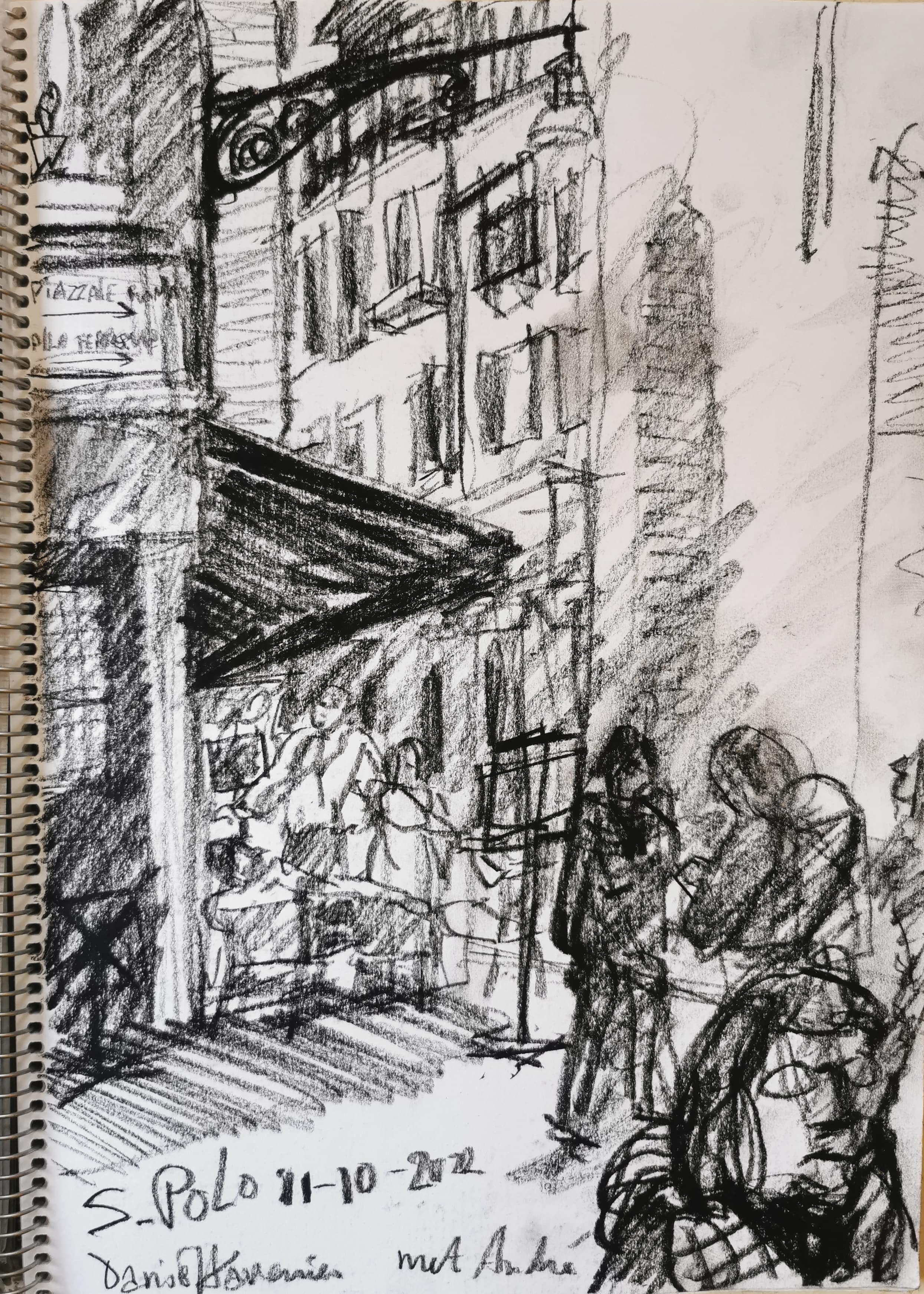 Met mijn goede vriend en kunst curator André Groeneveld op naar de Biënnale in Venetië. Wat een indrukwekkend evenement! Een korte reis met veel kunst bekijken, genieten van het prachtige Venetië, veel emoties en mooie momenten, schetsen op een placemat bij Trattoria dai Tosi en een tekening in het gastenboek van Trattoria da Romano (op het eiland Burano): een hele eer! Al was de Biënnale nog zo mooi, het meest poëtische was het wasgoed aan de waslijn. Ik hoop hier nog een mooie serie schilderijen en litho’s van te maken.