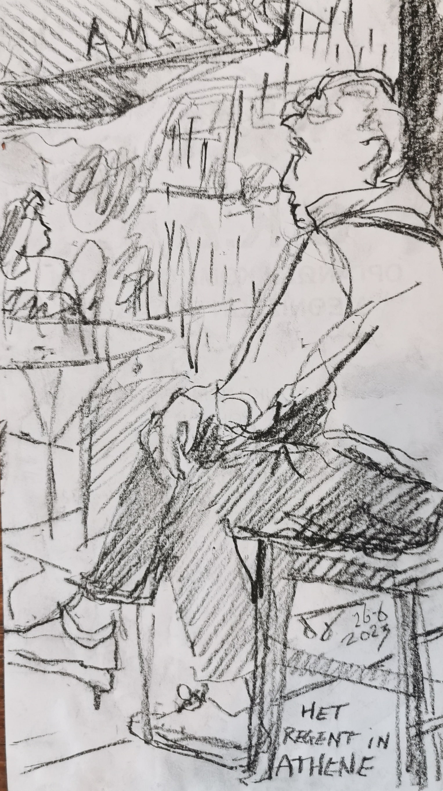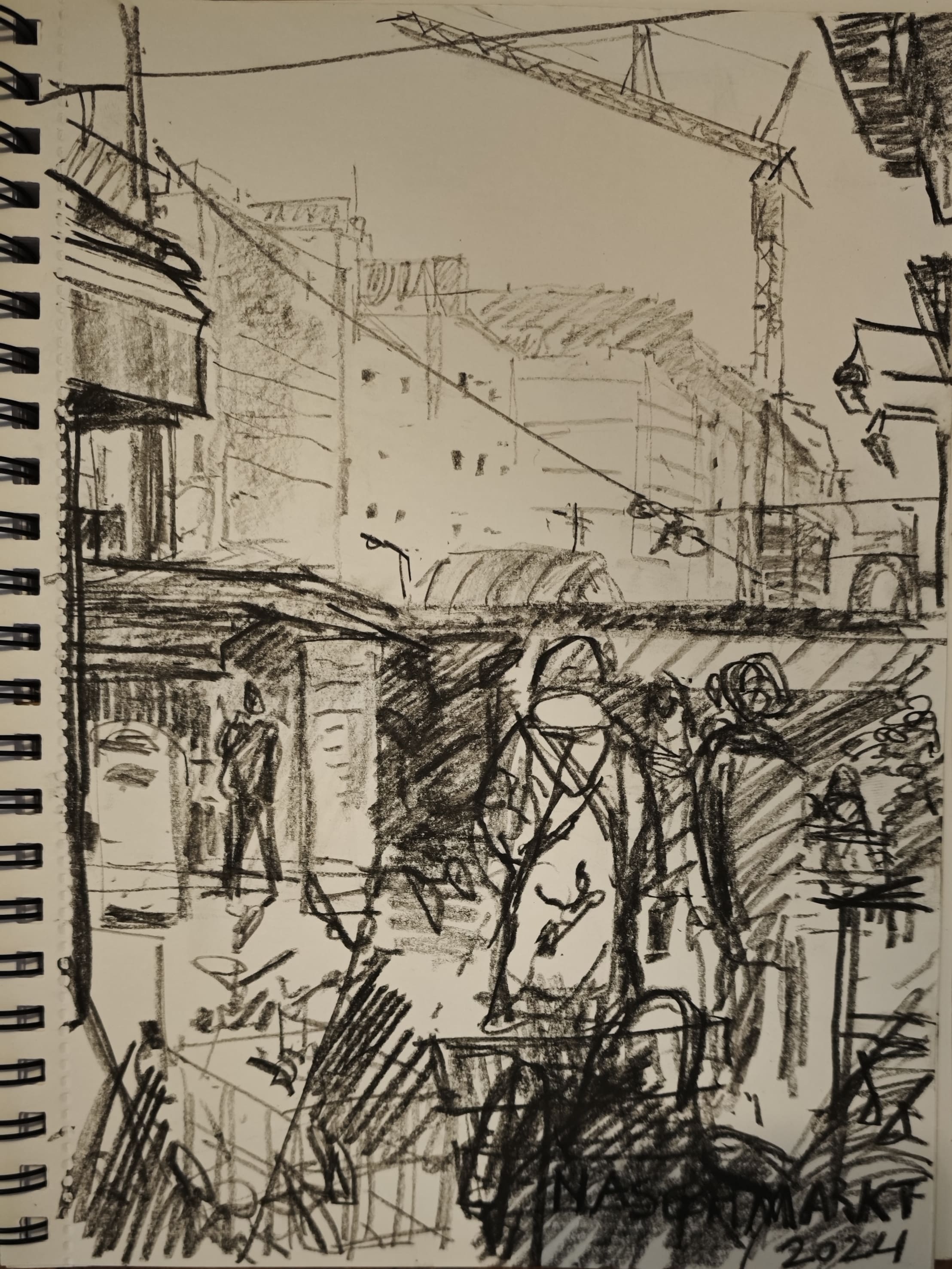 Dag 4 leverde een schets op in Café Museum, waar Gustav Klimt koffie dronk met gelijkgestemden en daar uitzicht had op het Wiener Secession Gebouw, wat de doorbrak gaf in Wenen naar de moderne tijd en de moderne kunst, begin 20e eeuw. Op dag 5 heb ik de Naschmarkt vastgelegd met al haar kraampjes en eettentjes en het uitzicht vanaf het terras van Café Wortner, waar we een laatste lunch aten in de buitenlucht van Wenen voor dat we de metro pakten naar het vliegveld van Wenen voor de terugreis naar Nederland.