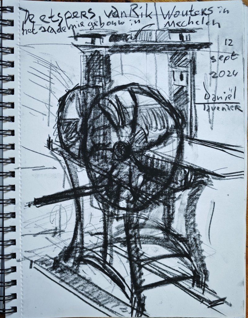 Van oudsher was er een opleiding in beelden maken en de kunstacademie van Mechelen heeft veel bekende beeldhouwers opgeleid. Om er maar twee te noemen: George Minne en Rik Wouters. De laatste was ook een goed schilder en graficus; ik ben gek van zijn werk. Hij leefde en werkte begin 20ste eeuw. Gastheer van ons fantastische B&B Lunatree (een klein museum op zich), Serge Leurs, is zelf een belangrijk filmmaker en tevens beeldhouwer; uiteraard daartoe opgeleid in Mechelen. Hij vertelde ons dat de oude etspers van Rik Wouters nog steeds in het grafieklokaal staat van de academie die letterlijk om de hoek van de B&B zit. Lisette en ik zijn er de eerste ochtend gelijk op af gegaan, we mochten daar zomaar naar binnen om een kijkje te nemen en zo kon ik een krijttekening maken in mijn schetsboek van de etspers van Rik Wouters.