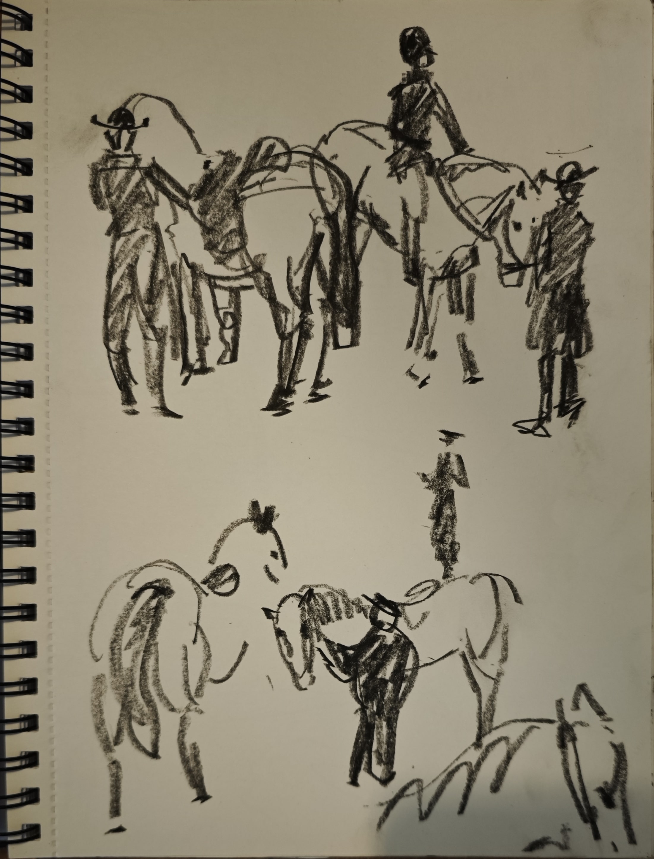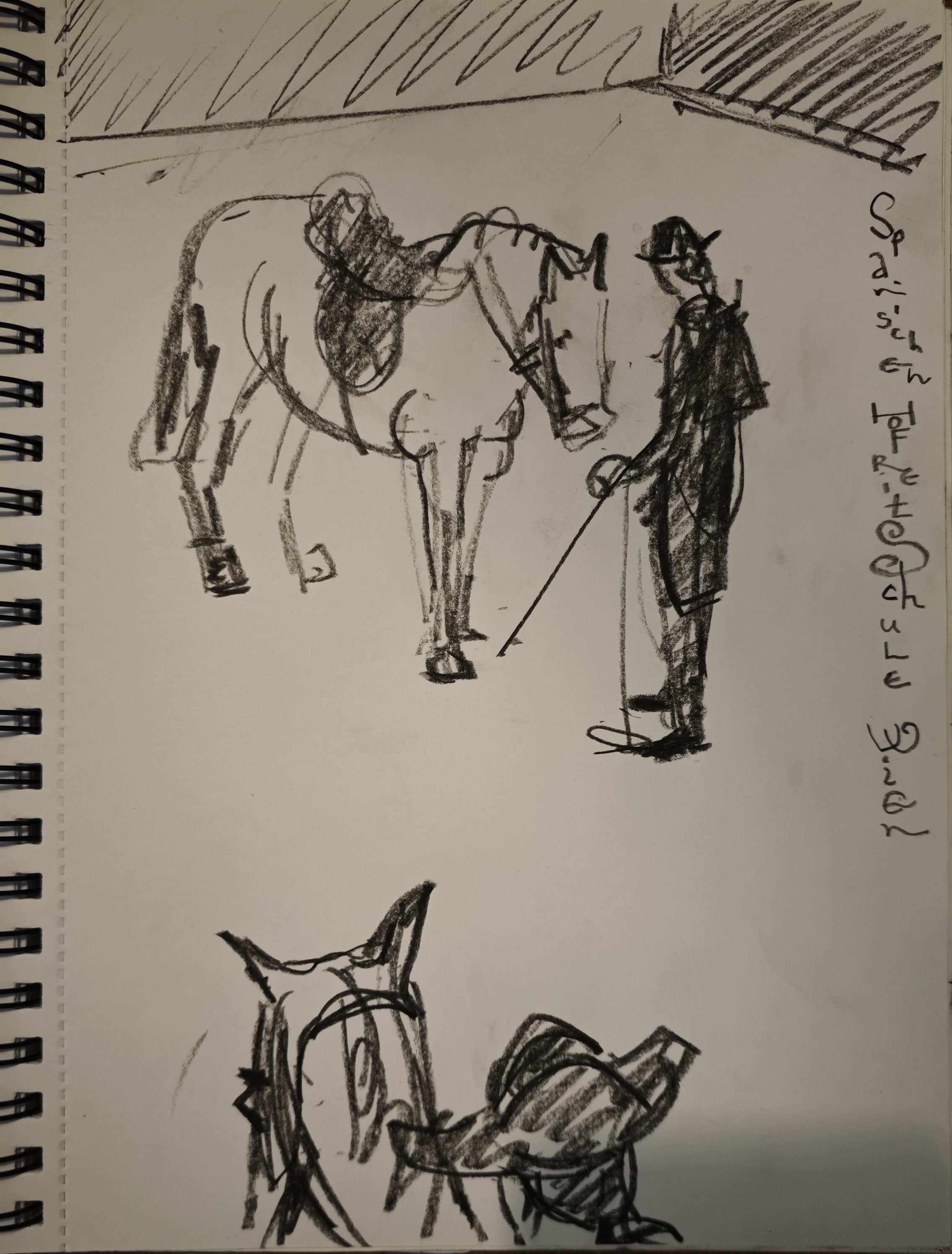 Dag 3 leverde een paar schetsen op van de Spaanse Lippizaner paarden (prachtige modellen) en de ruiters van de Spanische Hofreitschule Wien. We woonden een training bij, wat erg interessant was om te zien.