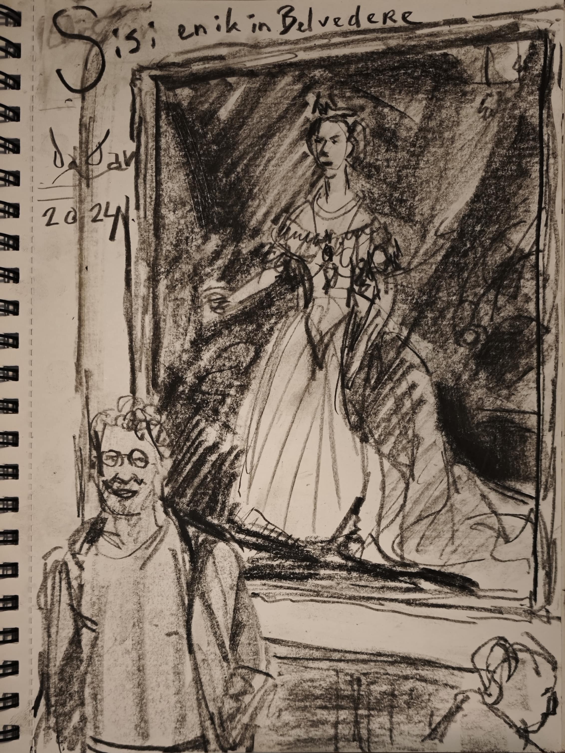 Dag 1: de eerste schetsen zijn gemaakt in Café Schloss in het Belvedere Museum. De schetsen zijn van Keizerin Sisi en Keizer Franz Jozeph die daar elk vereeuwigd in een schilderij aan de muren hingen. Vroeger keken we thuis in de kerstvakanties soms de films van ’Sisi’ (wie niet), maar zo zoet was de werkelijkheid geloof ik. We hebben het niet gered naar Schloss Schönnbruhn te gaan, maar wie weet keren we nog eens terug naar Wenen, want er valt nog zoveel te zien!