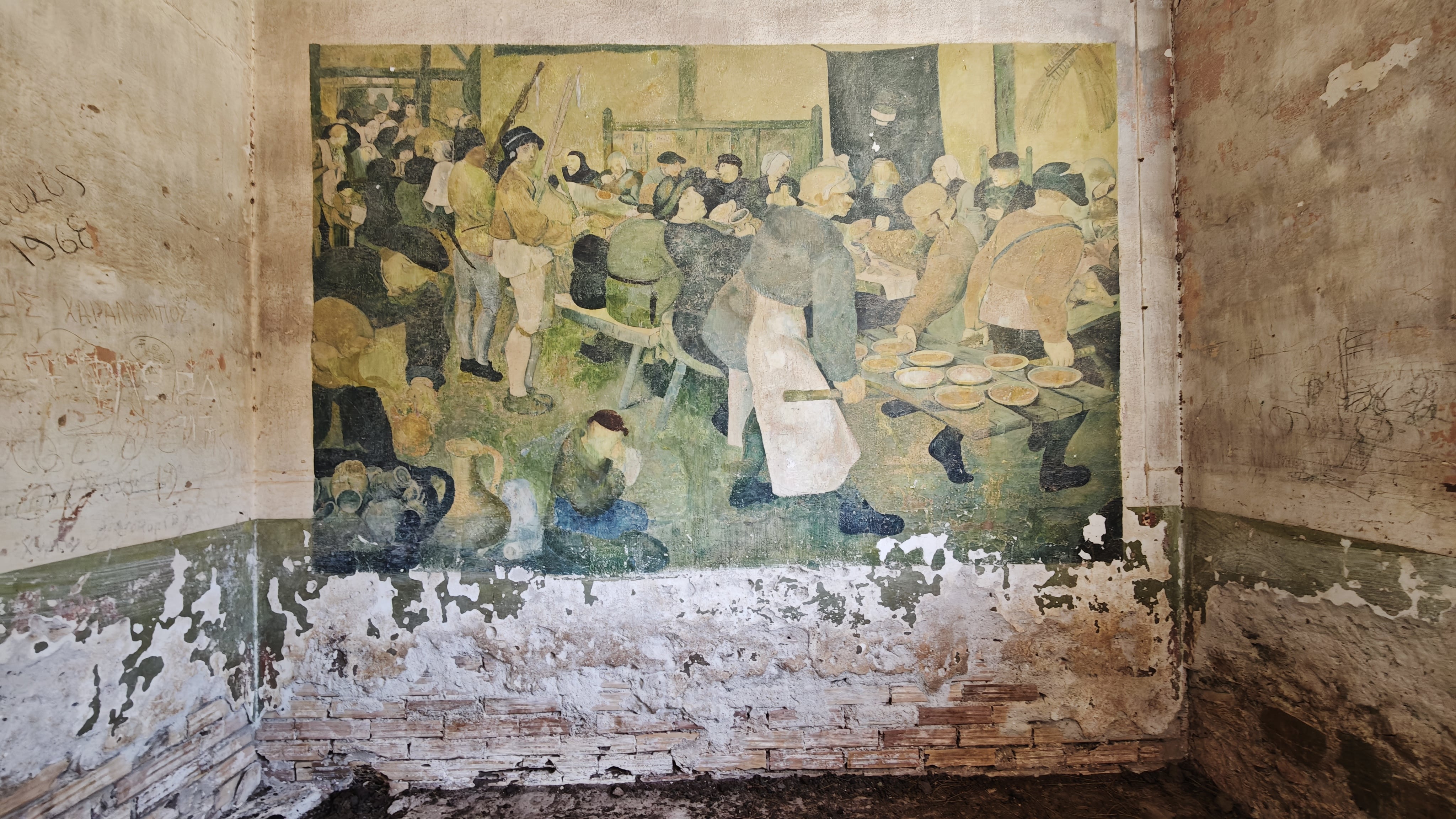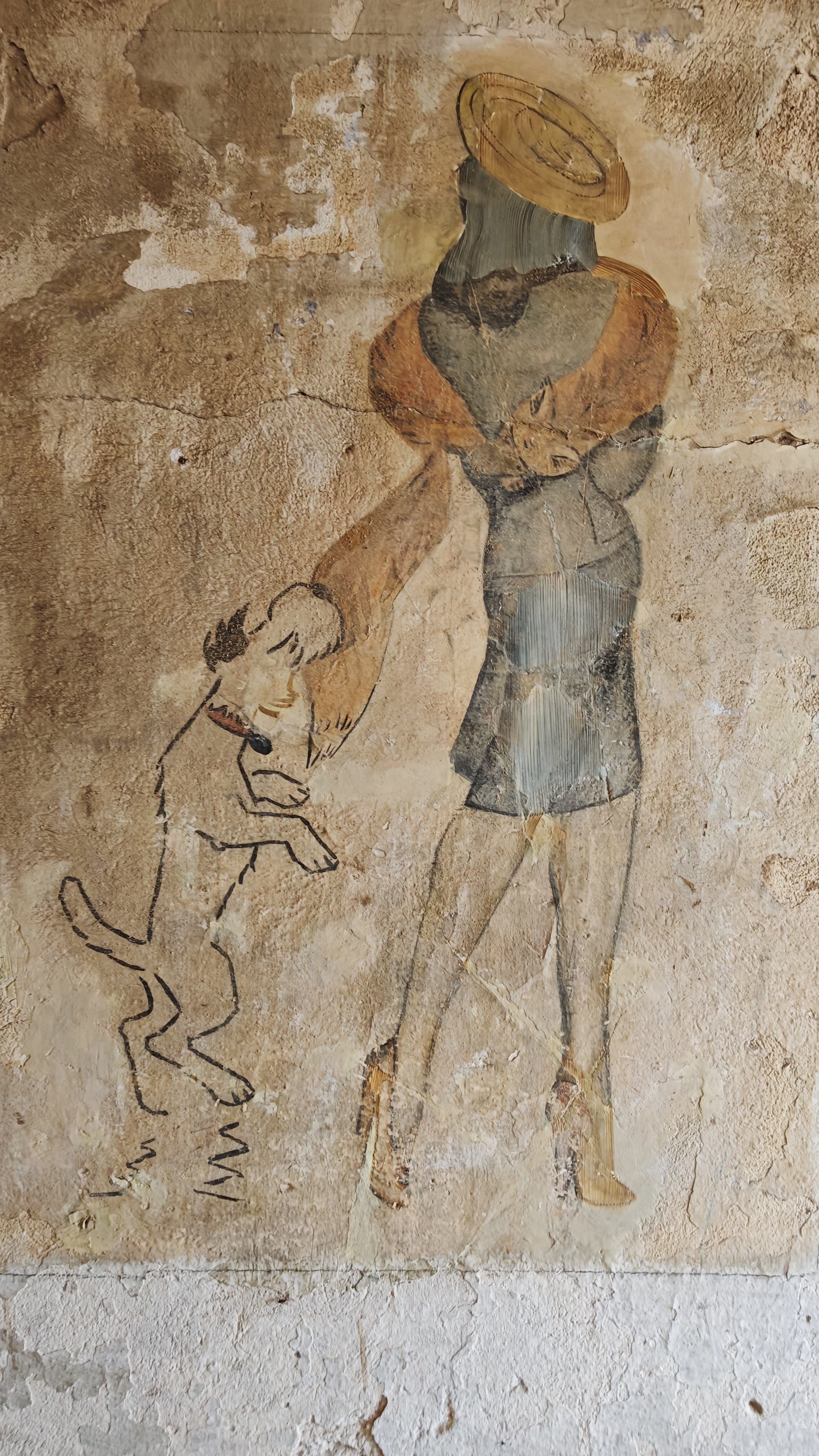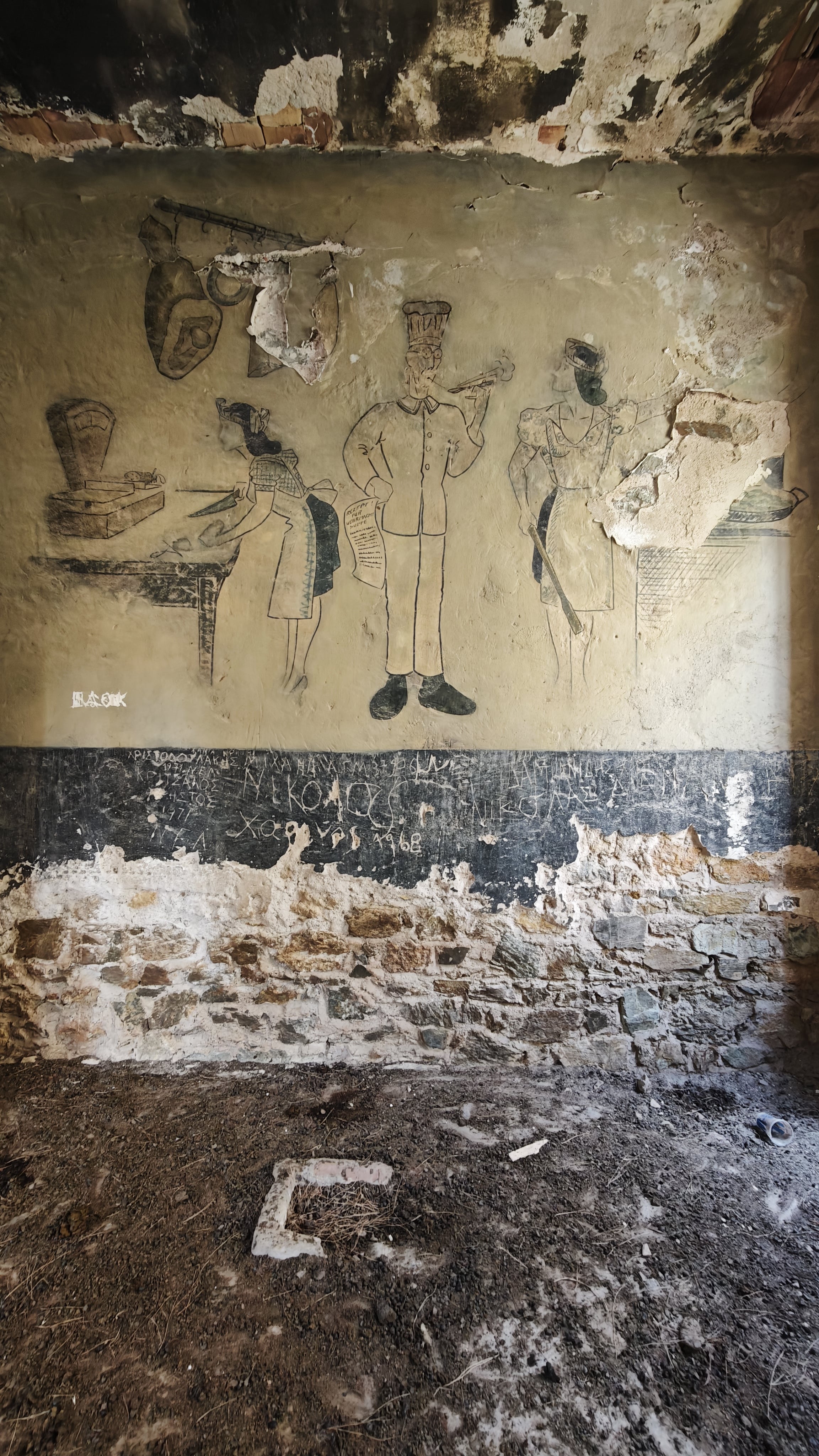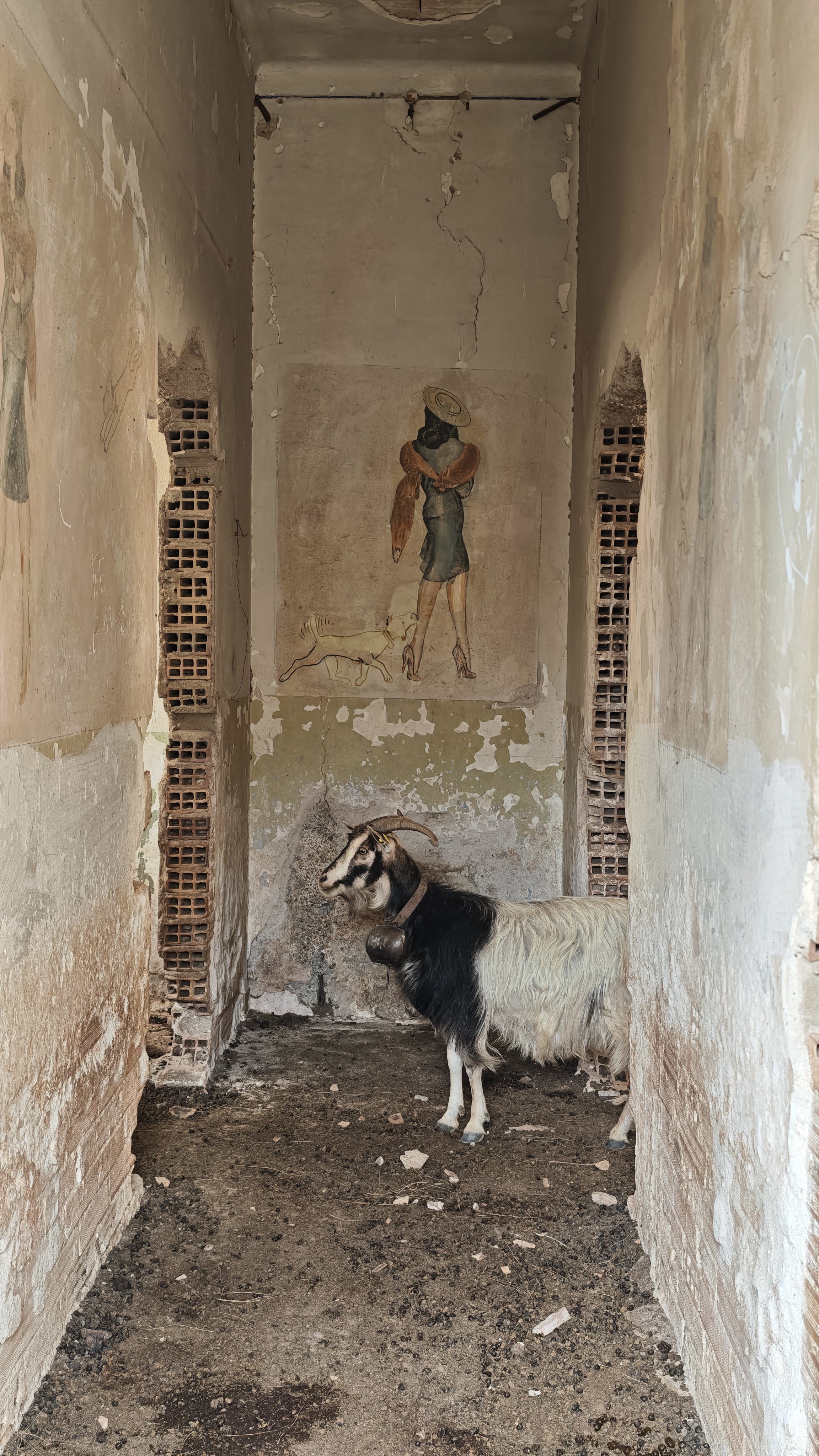 Al stuurde ons naar een plek waar soldaten waren gestationeerd in de oorlog en waar nog een grote oude oorlogsbarak te vinden is. Kunstenaars hebben hier later muurschilderingen gemaakt, o.a. van Bruegel. Na een half uurtje wandelen kwamen we aan en het gebouw zat stampvol met geiten en schapen. Dit leverde hilarische taferelen op, maar het is ook tragisch want zo gaat iets bijzonders snel verloren. Van die plek wil ik nog wel een schilderij gaan maken. Op het terras van ons appartement heb ik een middag zitten aquarelleren met vlak voor mij uitzicht op de zee en het nest van een kraai met 3 jonge kraaitjes (hoe toevallig is dat?).