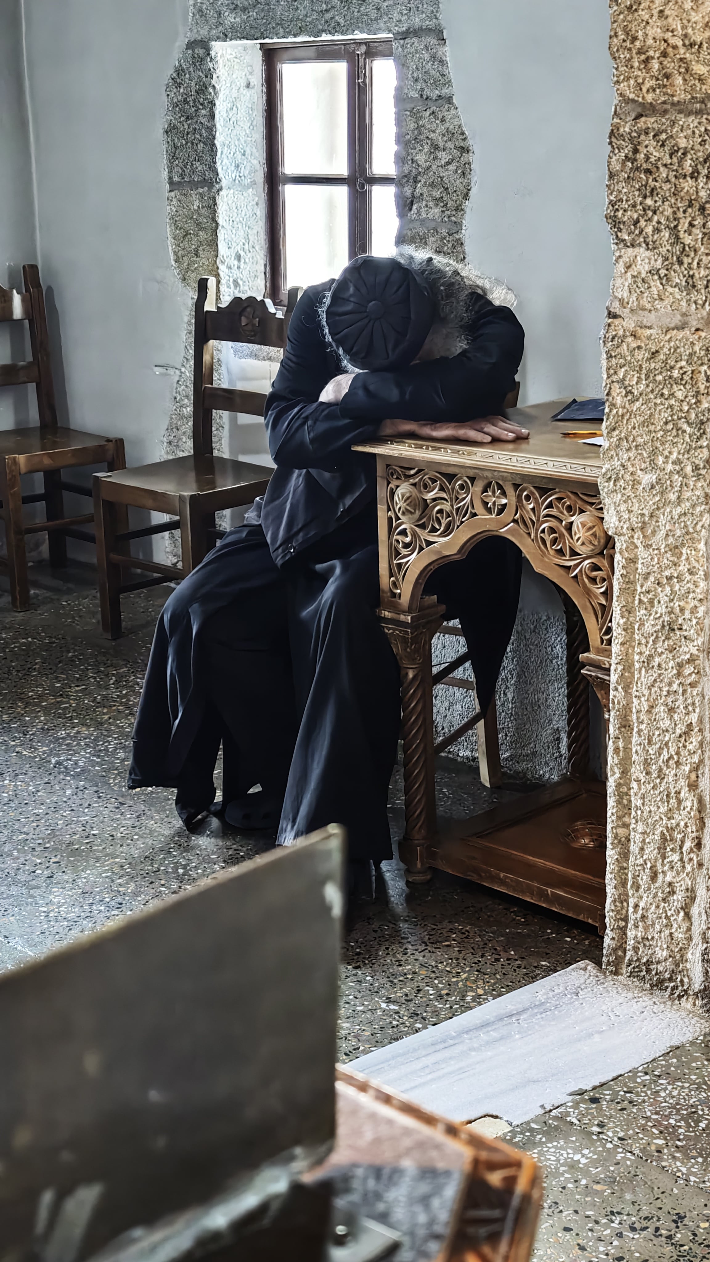 Naast Chora is de grot waar Johannes het visioen kreeg een grote toeristische trekpleister. Daar wilden wij natuurlijk ook naar toe, want het is een belangrijk stuk geschiedenis! Lisette hield goed bij wanneer de cruiseschepen het eiland aandeden, zodat wij op rustige momenten de bezienswaardigheden konden bezoeken. We kwamen een uur aan voordat de massa zou komen. Fotograferen was niet toegestaan in de grot en het bijbehorende kerkje, maar Lisette kon het niet laten een foto te nemen van een Papas, die zuchtend zijn hoofd liet rusten in afwachting van weer een lading toeristen. We noemen hem de ‘slapende’ Papas, maar hij sliep dus niet. Is dat wat je als Griekse Papas wil, steeds weer zo’n golf aan toeristen, zou hij dat leuk vinden denk je dan? De foto schetste zo’n prachtig beeld en éénmaal thuis heb ik het geschilderd, eerst heb ik een aquarel gemaakt en later heb ik de Papas geschilderd op doek! Zowel de aquarel als het schilderij laat ik gauw zien! Patmos, het eiland van de theologie… ik vond het heel bijzonder!