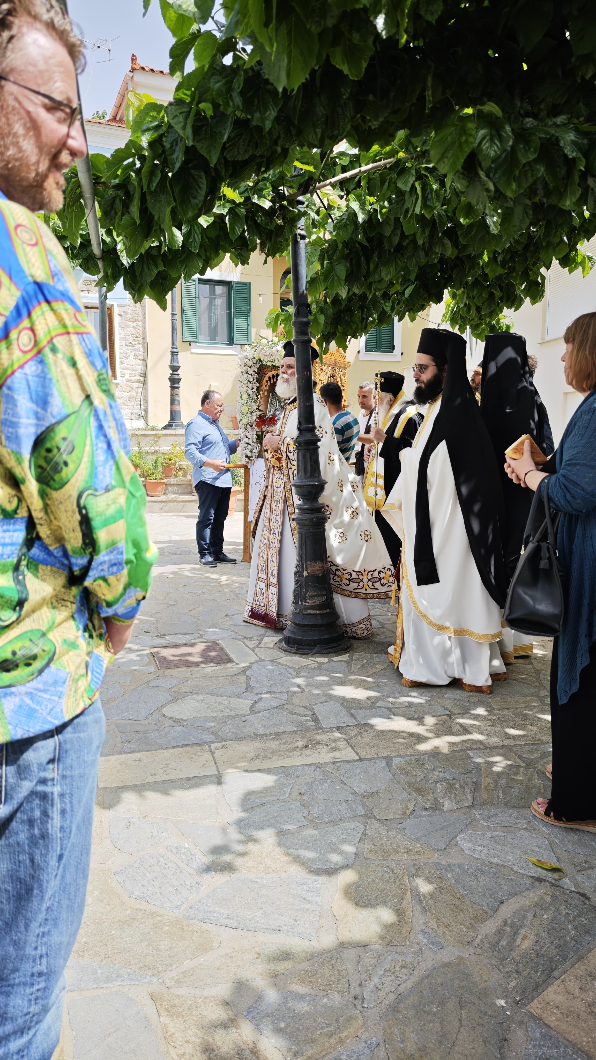 Het is alsof we in een oude film terecht komen, de dorpelingen heten ons welkom, laten ons plaats nemen in die bijzondere kerkdienst met een eeuwenoud karakter. Een kerkdienst vol iconen, zang, kaarsen, wierook en veel priesters en de bisschop van Samos en Ikaria. Na die dienst moeten we mee naar het dorpshuis en mogen we mee eten. De volgende ochtend volgt er nog een kerkdienst met processie en weer een maaltijd. We vallen met ons neus in de (bijzondere) boter. Ik mag tijdens de maaltijden de priesters tekenen die het stieken toch wel interessant vinden. Ze reageren ontzettend leuk. We zoeken een dag later één van de priesters nog op in zijn klooster en ook bezoeken we het kleine kerkje van Agios Markarios in de velden, een landschap dat net een schilderij van Van Gogh is. Dat kerkje was echter te klein voor deze viering.