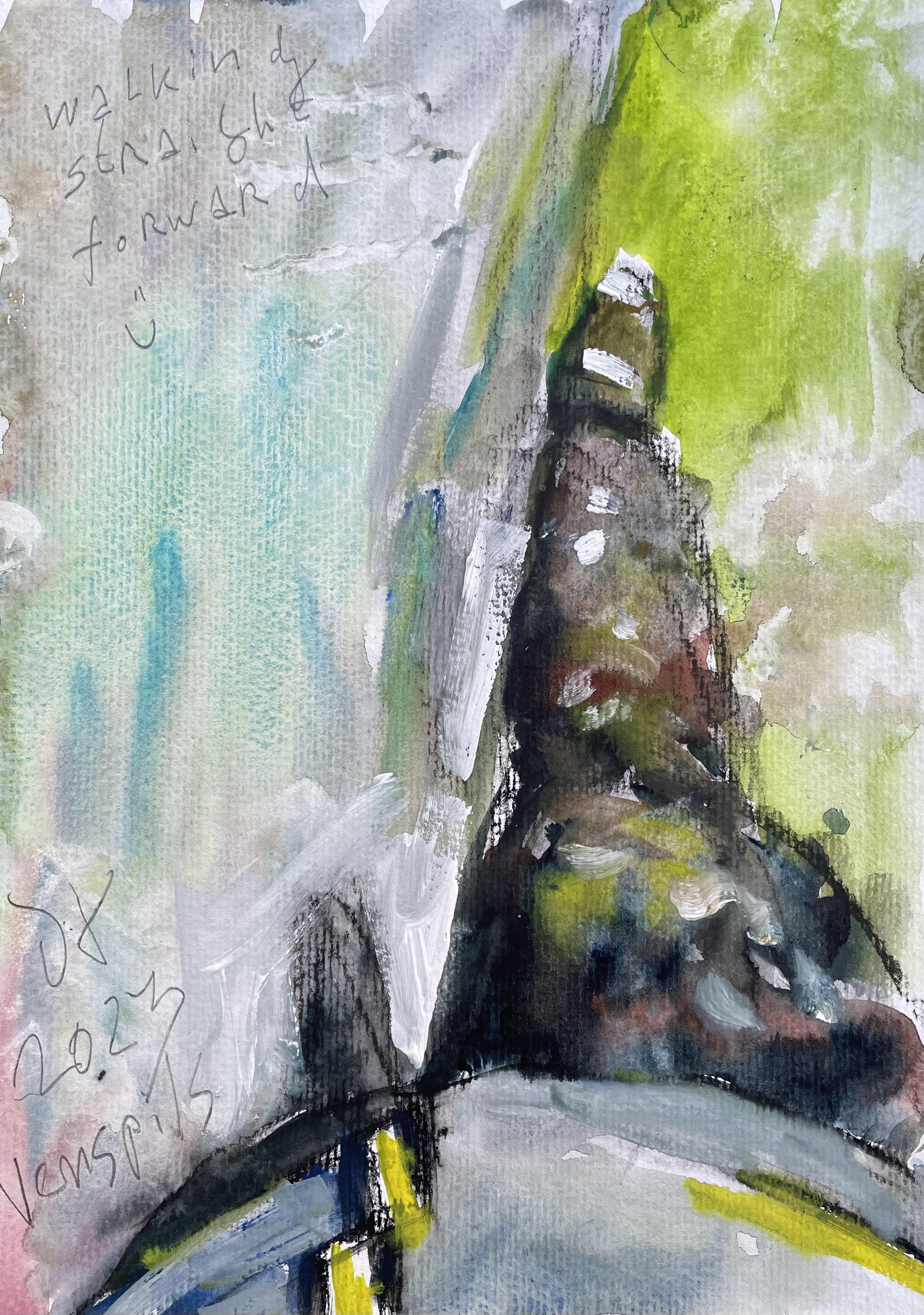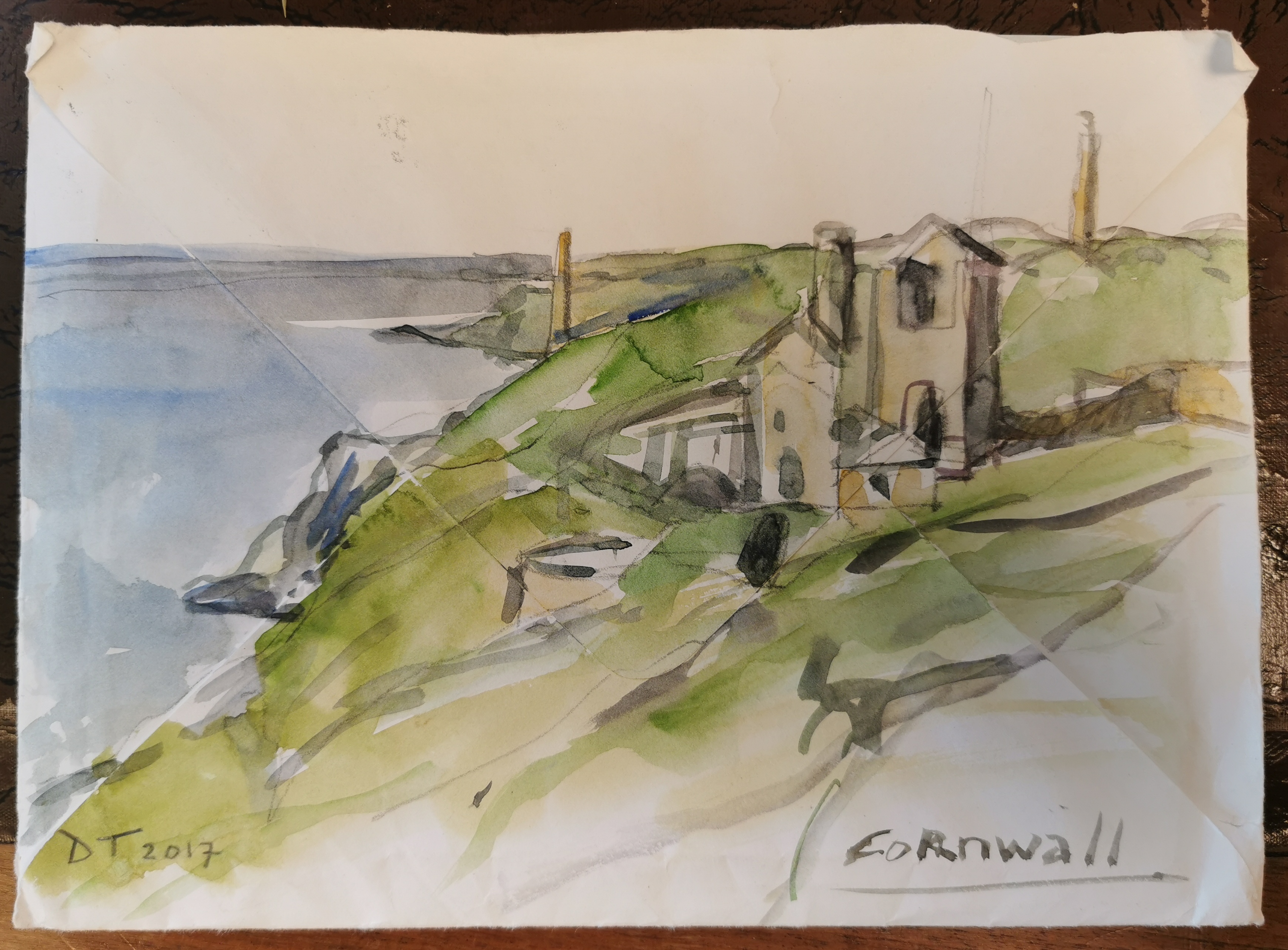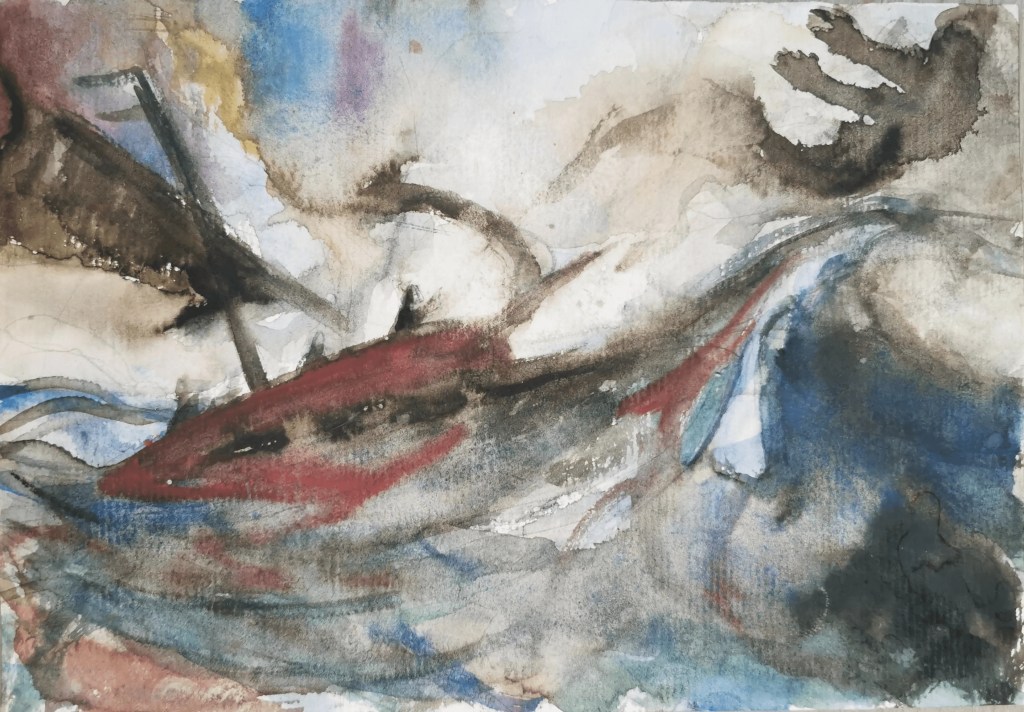 Op 1 juni 2016 vertrok ik voor een maand naar Ierland en Schotland met aquarelverf en lege katernen van aquarelpapier. Ik ging ‘Op zoek naar sporen van Jeroen” en wilde over deze zoektocht een boek maken. Ik had zelf aquarelverf gemaakt van pigment en bindmiddel en ik had bijzonder papier gevonden waar ik mee uit de voeten kon. Eenmaal thuis werkte ik nog 10 maanden door aan het boek, totdat ik 244 pagina’s voltooid had, voornamelijk met aquarelverf.