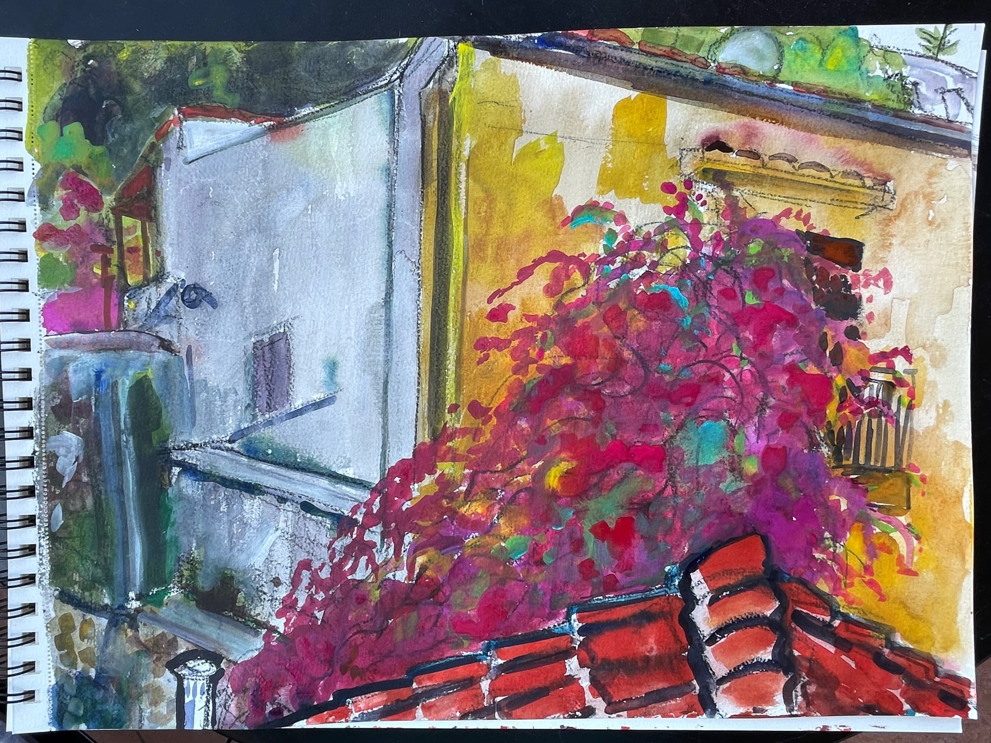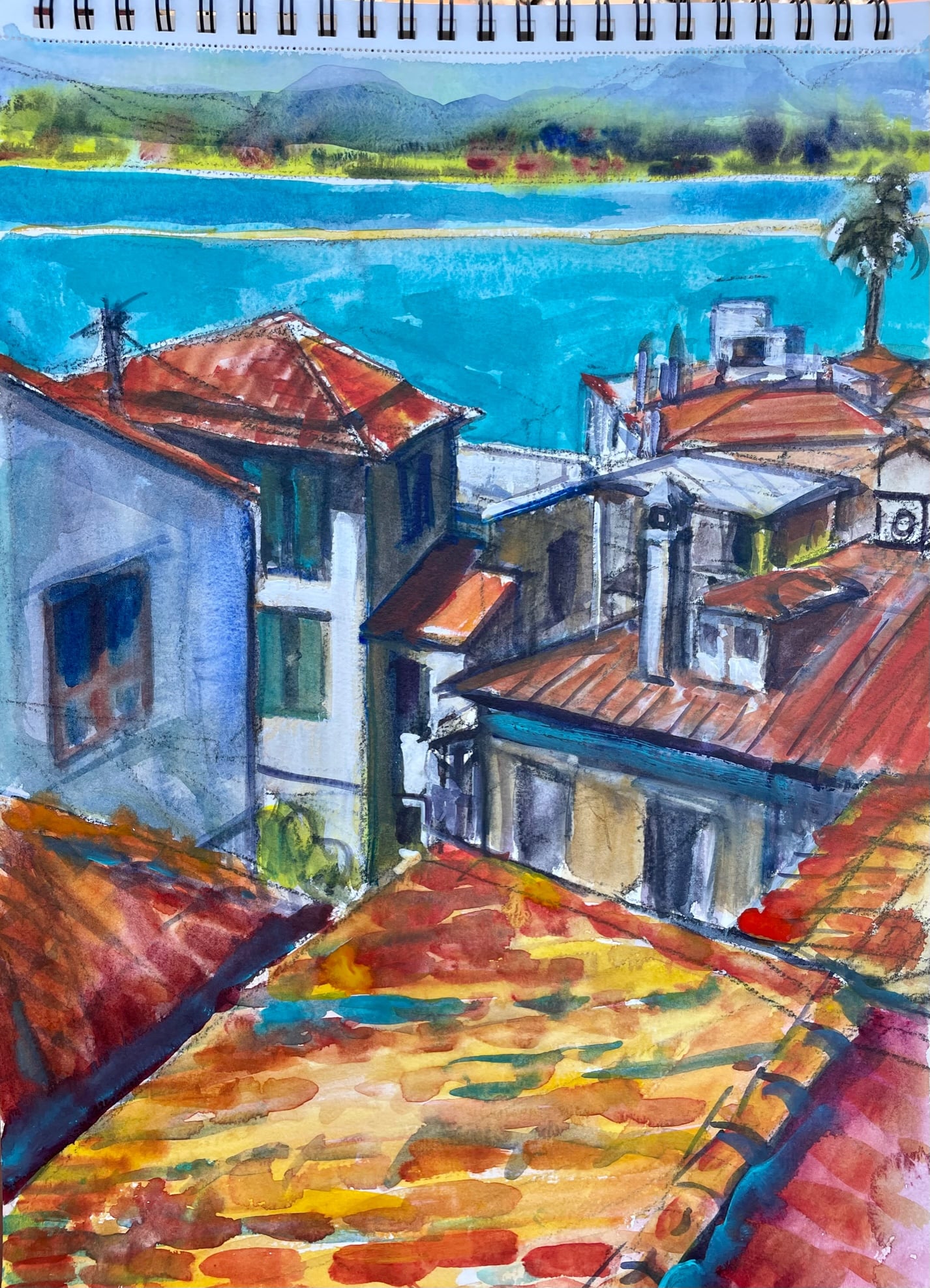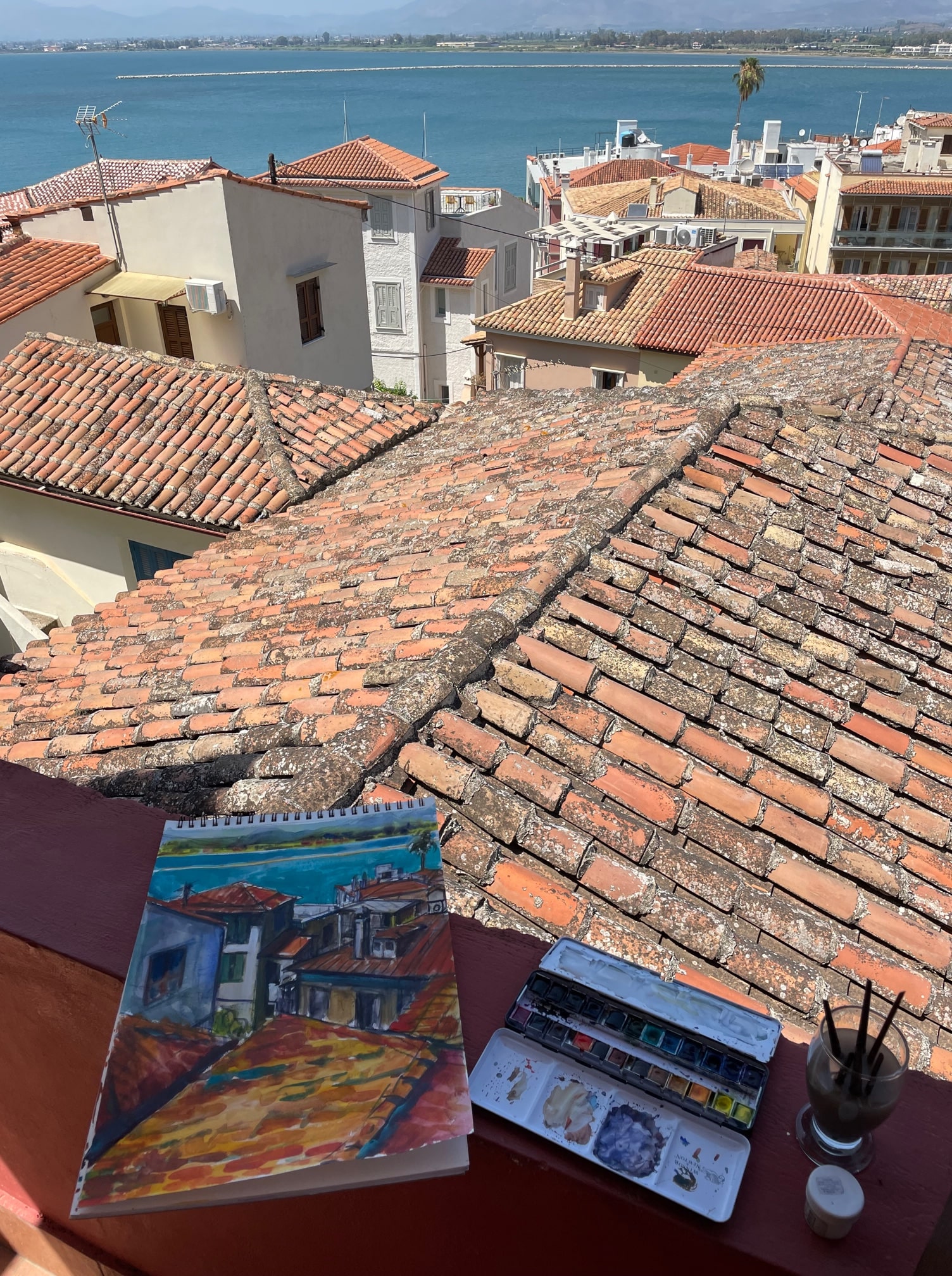 In Nafplion heb ik op “ons” dakterrasje heerlijk zitten aquarelleren, ik heb de daken geschilderd en de prachtige bougainville aan de voorkant van het Palazzo waar Lisette en ik verbleven.