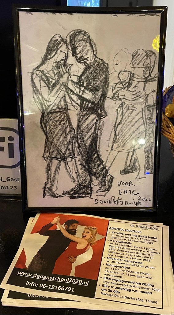 Deze tekening hangt bij Dansschool 2020 aan de muur en is gemaakt toen er een Argentijnse tangoavond werd georganiseerd.