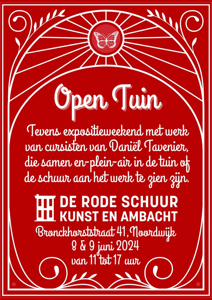 Op 8 en 9 juni 2024 doet de tuin van De Rode Schuur mee met Open Tuinen, onderdeel van Markt onder de Linden van De Oude Dorpskern Noordwijk-Binnen. Ik wil gedurende deze 2 dagen van de gelegenheid gebruik maken mijn cursisten hun werk te laten exposeren.