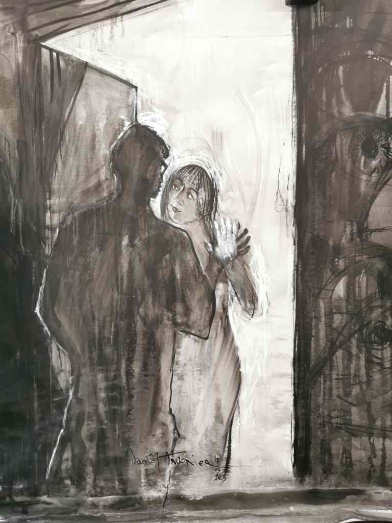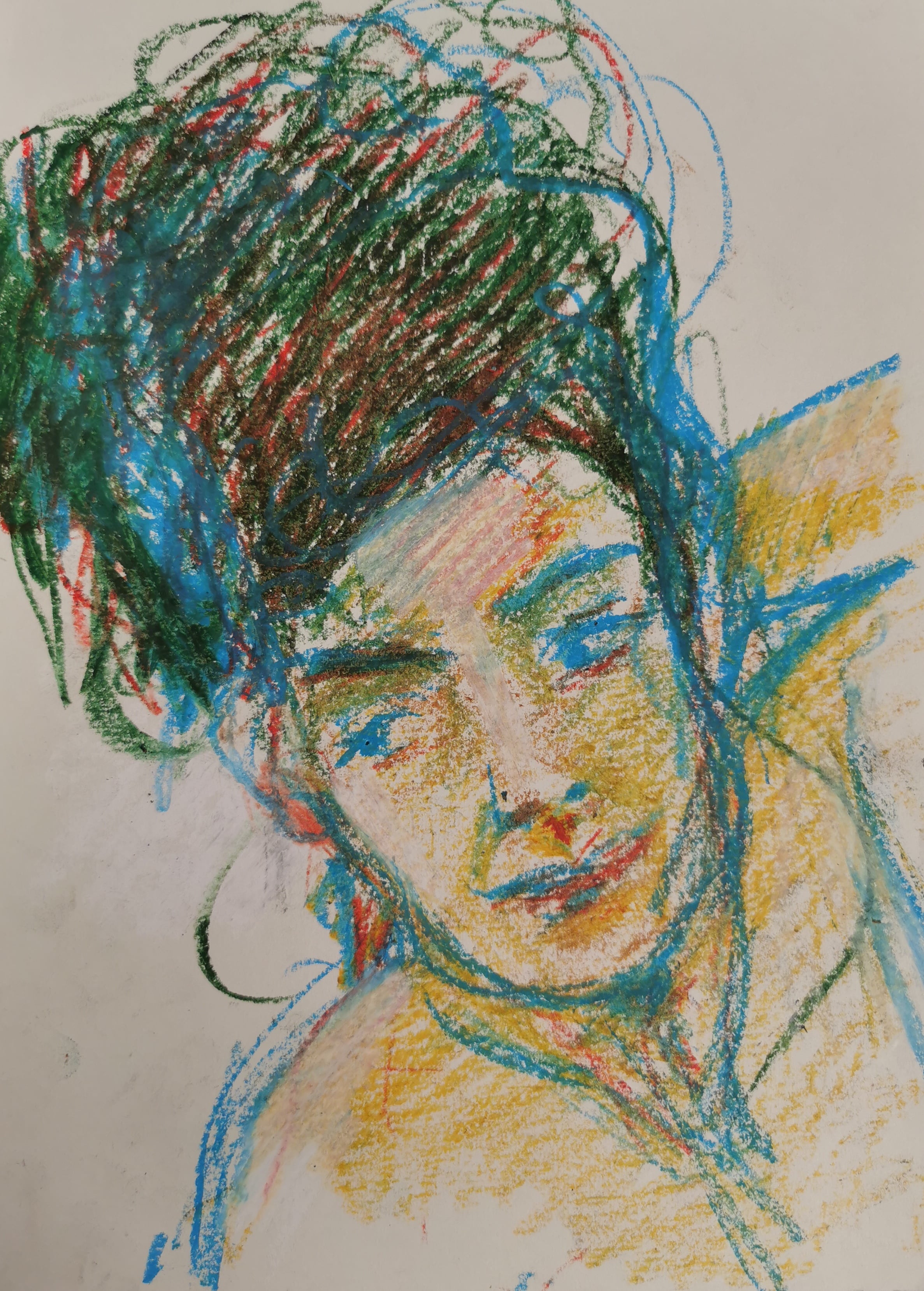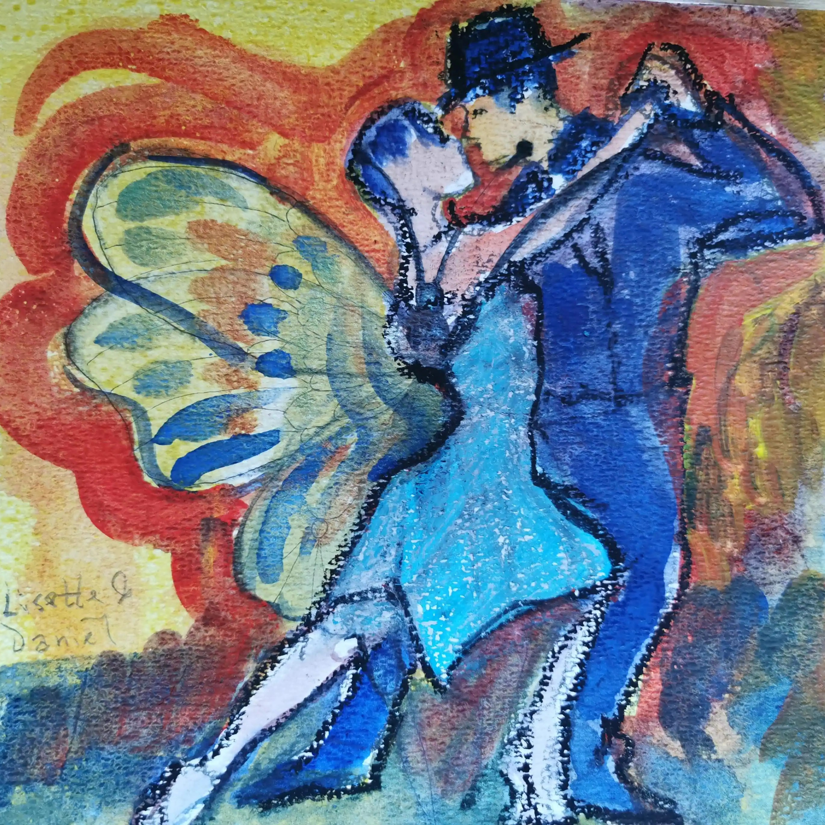 In 2022 ben ik op dansles gegaan. Ik heb hier heerlijk mijn gedachten kunnen verzetten, ingewikkelde danspassen geleerd, op tenen gestaan… maar vooral genoten en ook van anderen die over de dansvloer vlogen. Wanneer ik zit te kijken maak ik een schets of foto en die werk ik dan later uit. Onderstaande werken zijn van een tango avond; ik heb op zwart aquarelpapier gesso, aquarelverf en soft pastelkrijtjes gebruikt. Dit knappe stel “hangt” inmiddels bij het danspaar aan de muur.