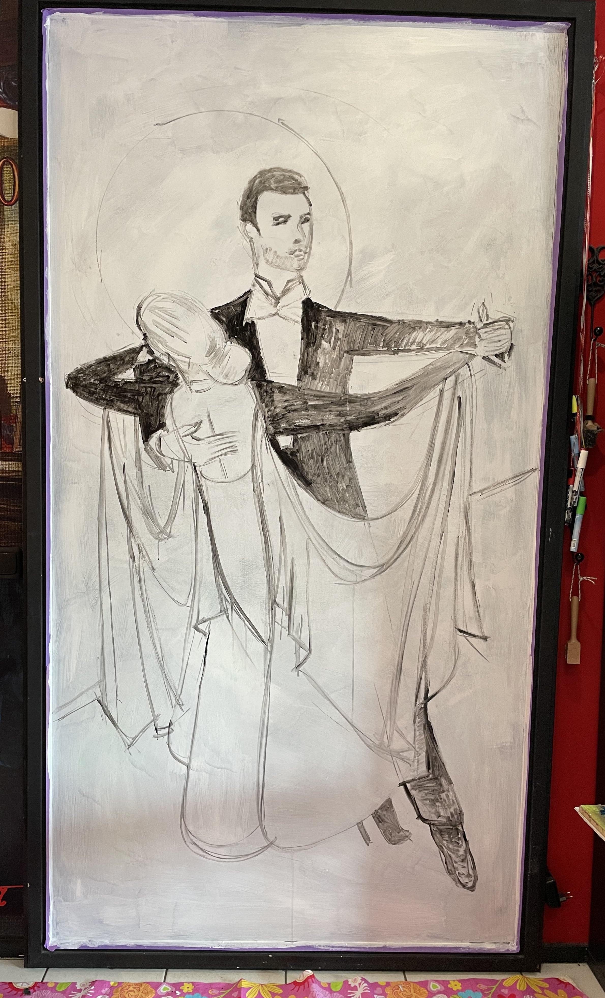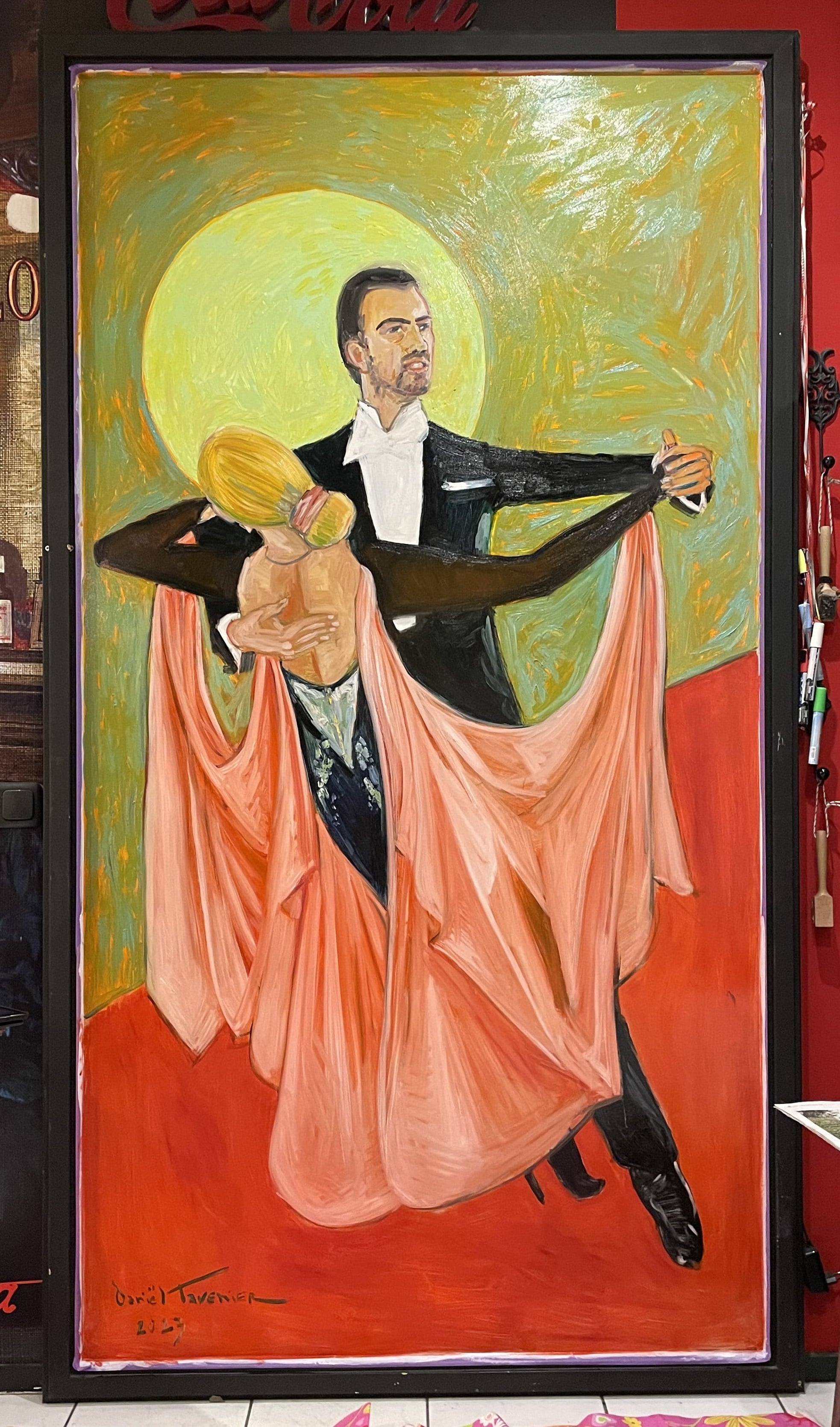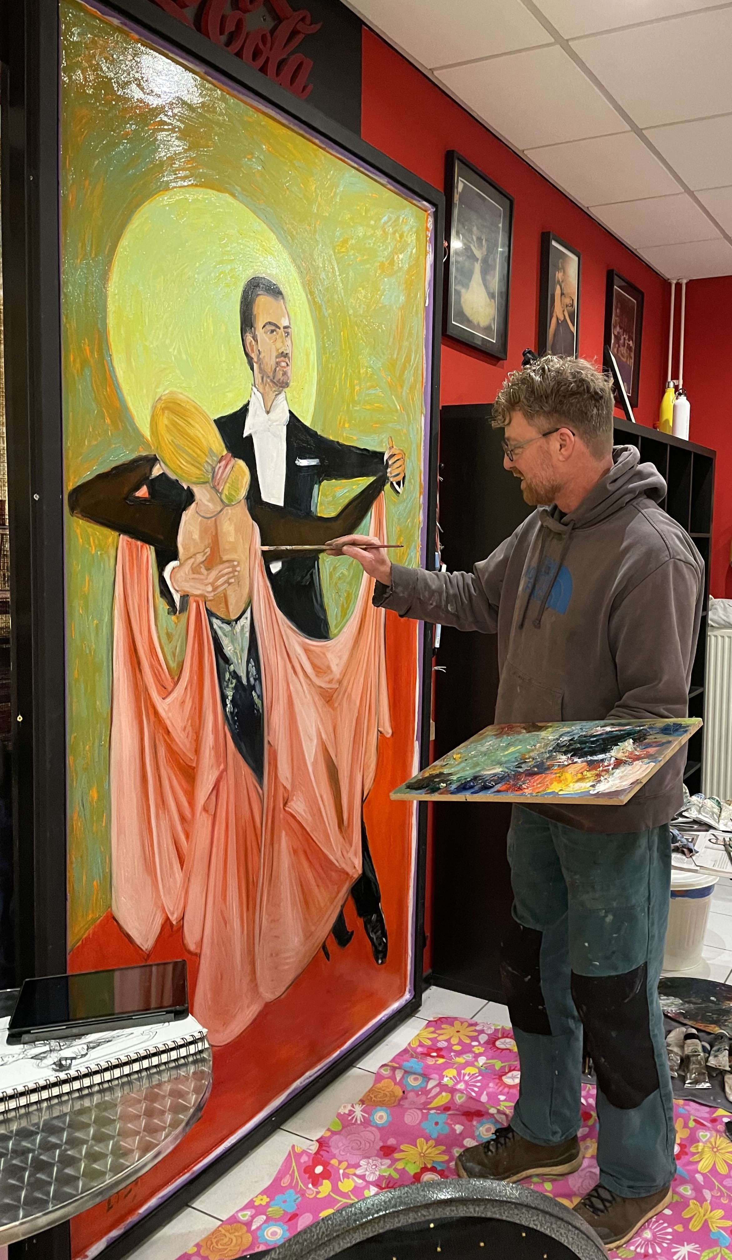 18 oktober 2023: “Ik had nog een mooie opdracht uitstaan bij De Dansschool Anno 2020. Ik was helemaal geïnspireerd door de prachtige expressieve kunst die ik met mijn vriend André heb gezien in Duitsland vorige week, en ik had er heel veel zin in vandaag. En zo heb ik dit mooie danspaar, zoon en schoondochter van Erik en Moniek, kleurig en ambachtelijk op de wand geschilderd! Ik vind het super dat mijn werk daar te zien is, want echt het is een hele gezellige dansschool!”